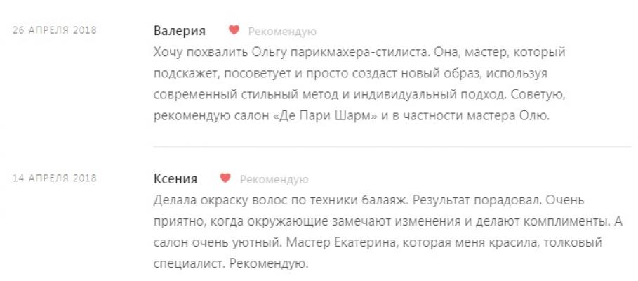 В салоне "Де Пари Шарм" приятная атмосфера, всегда вкусный чай кофе, душевный прием и опытные профессионалы парикмахеры. Они не просто окрашивают - они придают образ, при этом заботятся о здоровье Ваших волос.