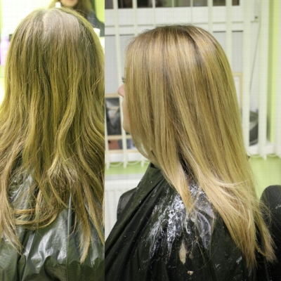 - репигментация (окрашивание мелирования или пористого блонда в натуральные тона):