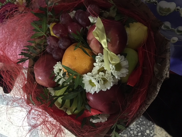 Добрый день! Спасибо огромное за фруктовый букет, все были впечатлены столь вкусному и яркому букету! Радуга подобранных цветов притягивала взгляды! Вы подарили нам массу улыбок!))