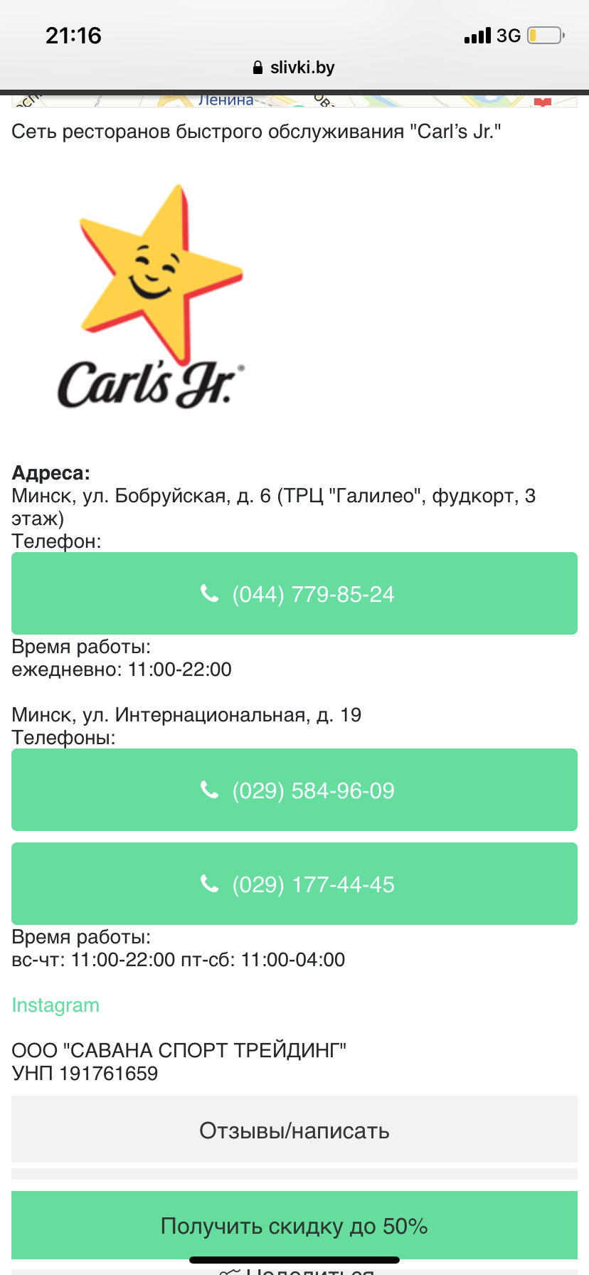 - Промокод дает право на скидку до 50% на 3 комбо на выбор в сети ресторанов быстрого обслуживания "Carl’s Jr."