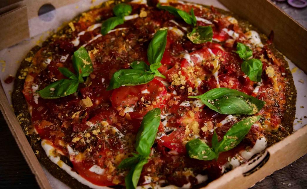Состав: основа для пиццы, соус сырный, соус томатный, шампиньоны маринованные, томаты, болгарский перец, цукини, лук красный, руккола сыроедческий пармезан