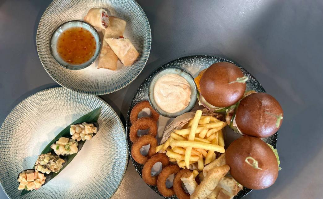 - мини-бургер с креветкой: булочка, креветка, сыр "Чеддер", помидоры черри, битый огурец, микс-салат, спайси соус - 1 шт (105 г)