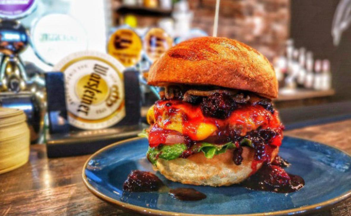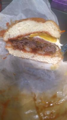- бургер "Острый" (говяжья котлета, сыр чеддер, микс салат, мармелад халапеньо, жаренный бекон, лук маринованный, соус острый)