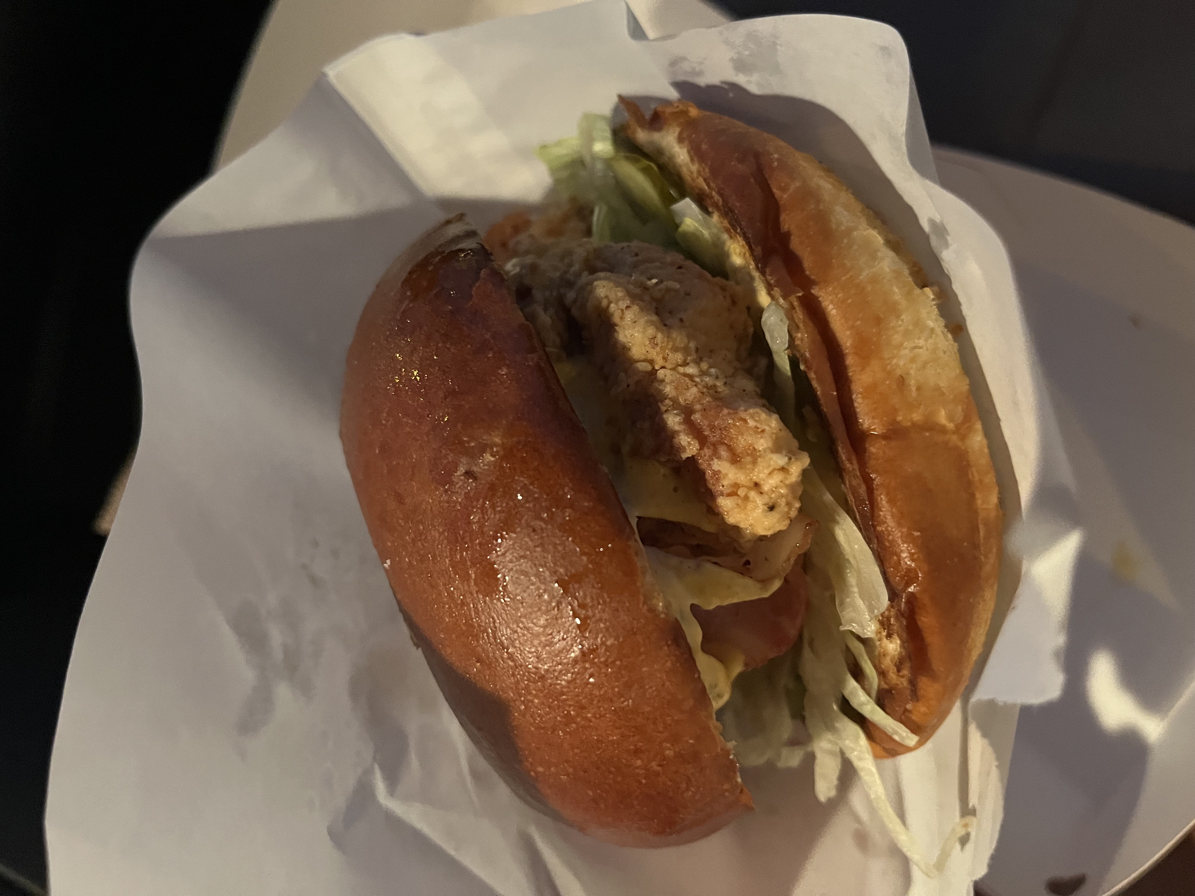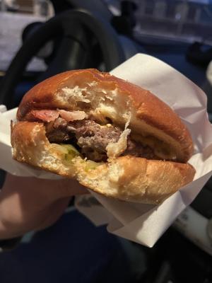 - бургер "Дранбургер" (280 г) - драники, котлета из говядины, бекон, сыр чеддер, кремчиз, лук, салат айсберг, помидор, огурец маринованный