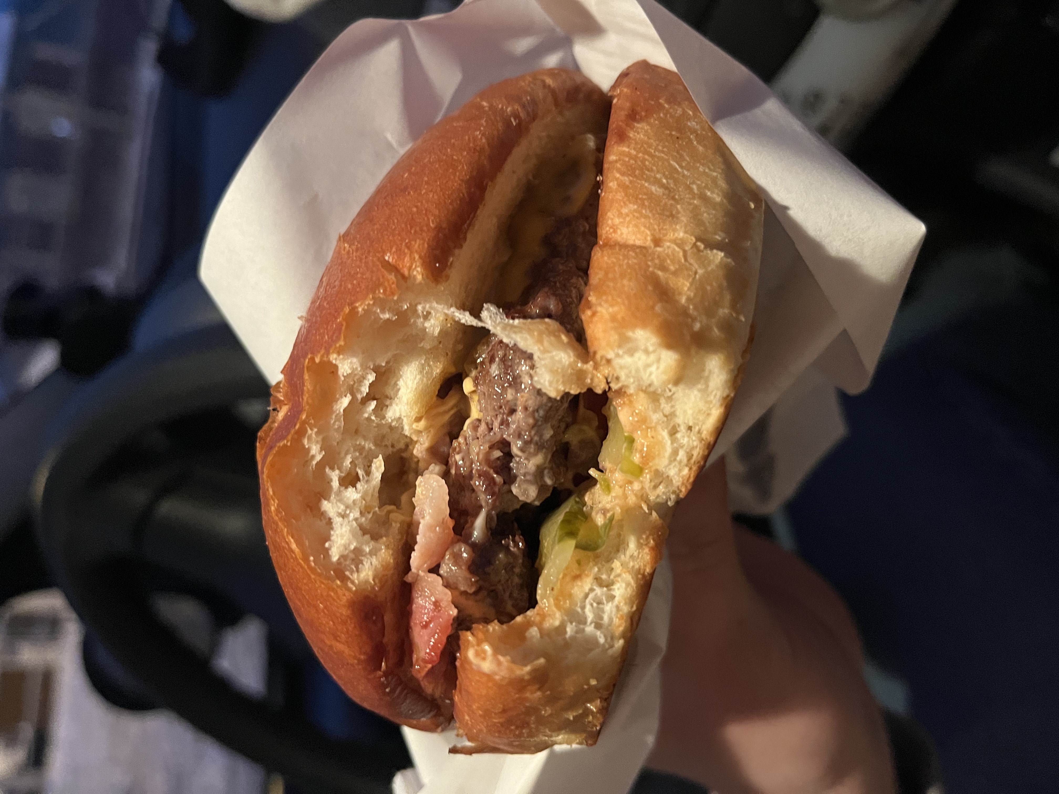 Состав: булочка бриошь, котлета из говядины, огурец маринованный, бекон, сыр чеддер, соус гриль, кетчуп, лук