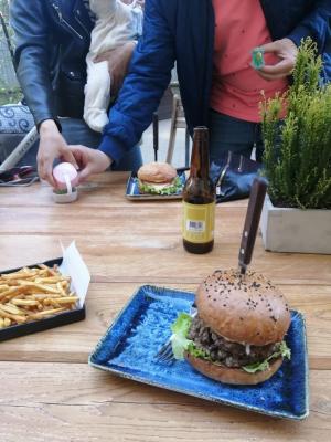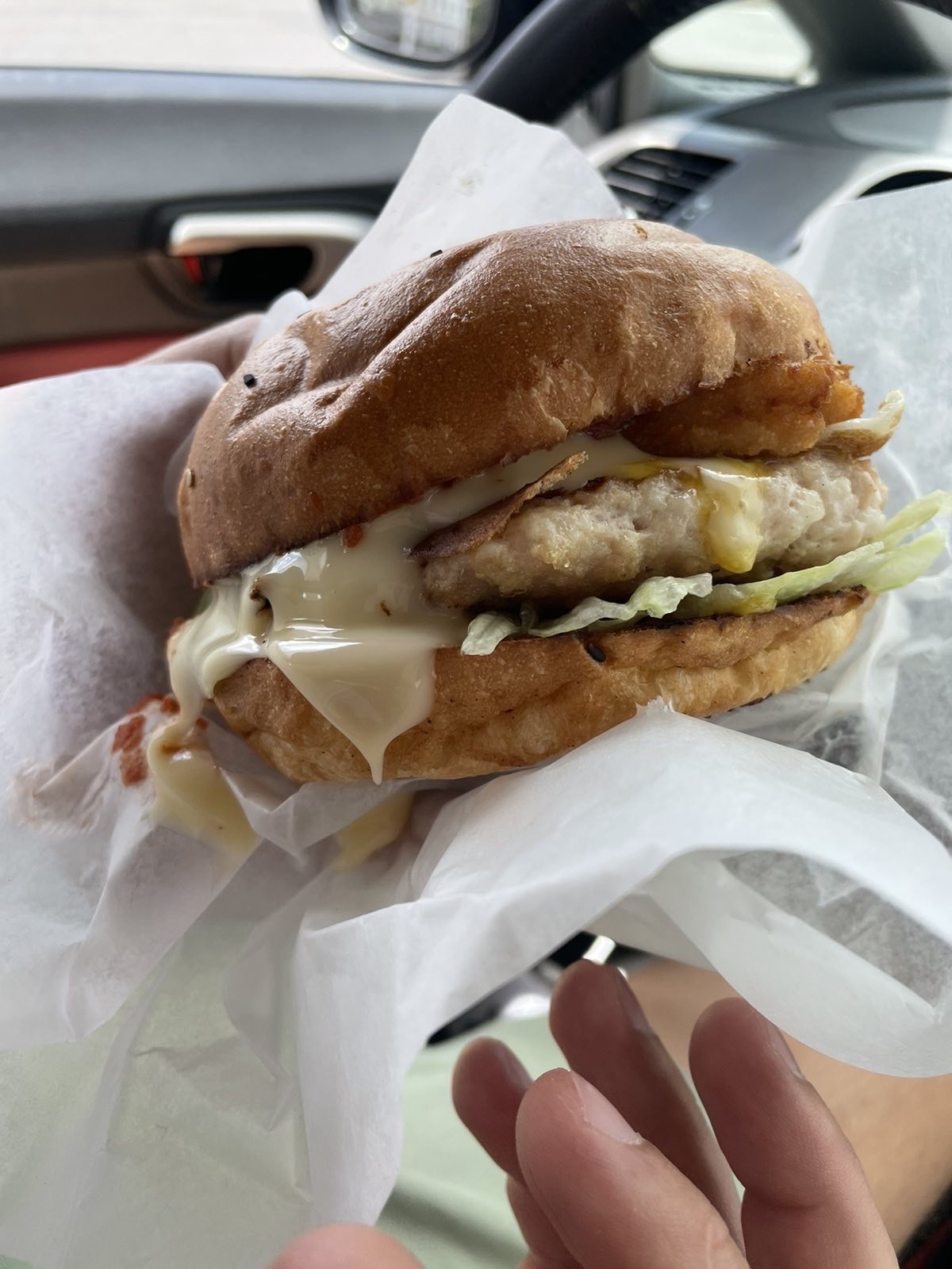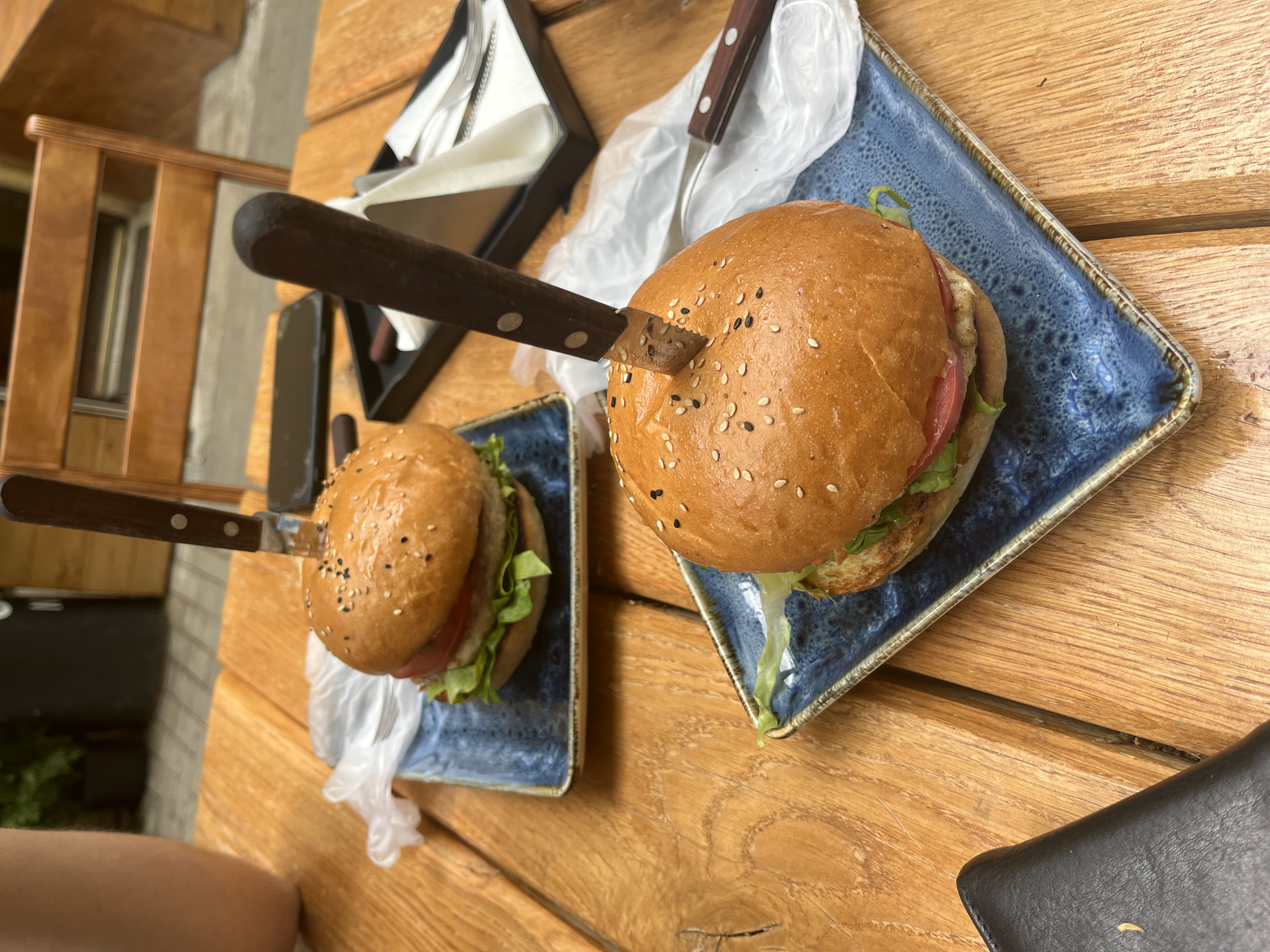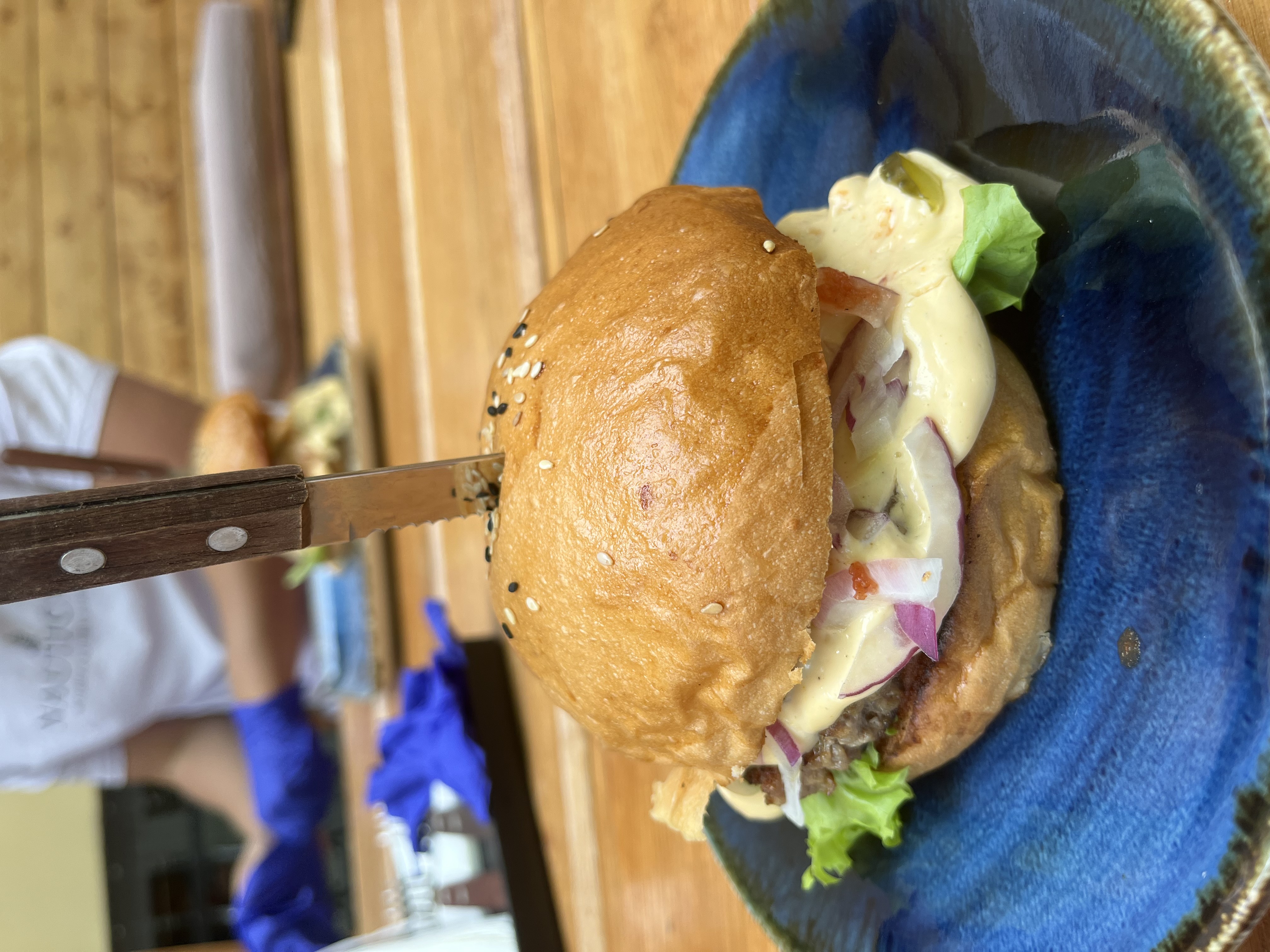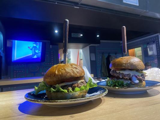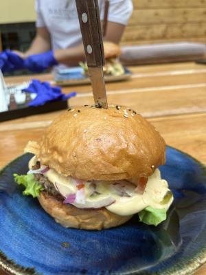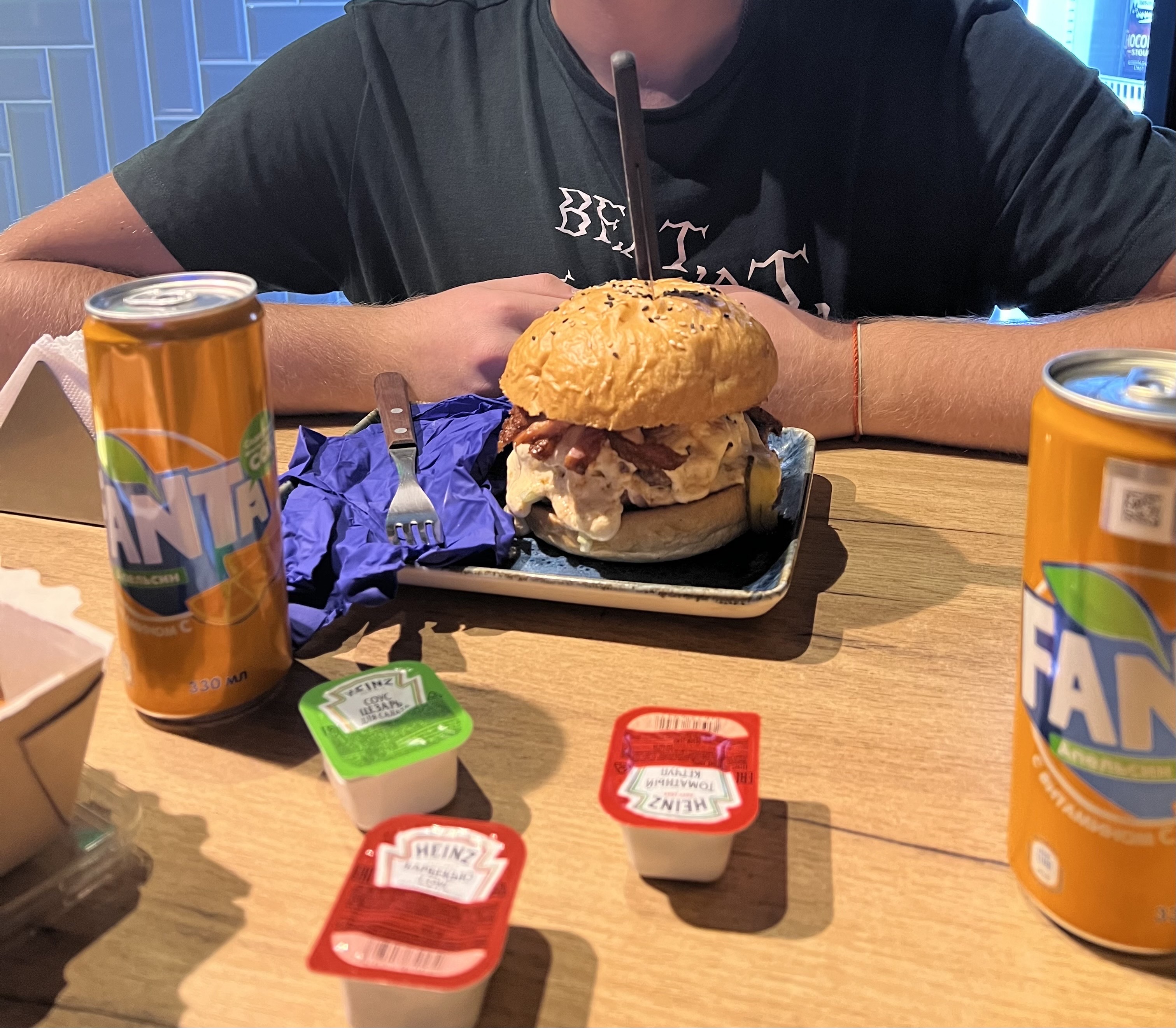 Состав: крафтовая булка, соус из перетертых томатов, салат айсберг, огурец свежий или соленый (на выбор), бекон, томат, красный лук (по желанию), сырный соус, говяжья или куриная котлета