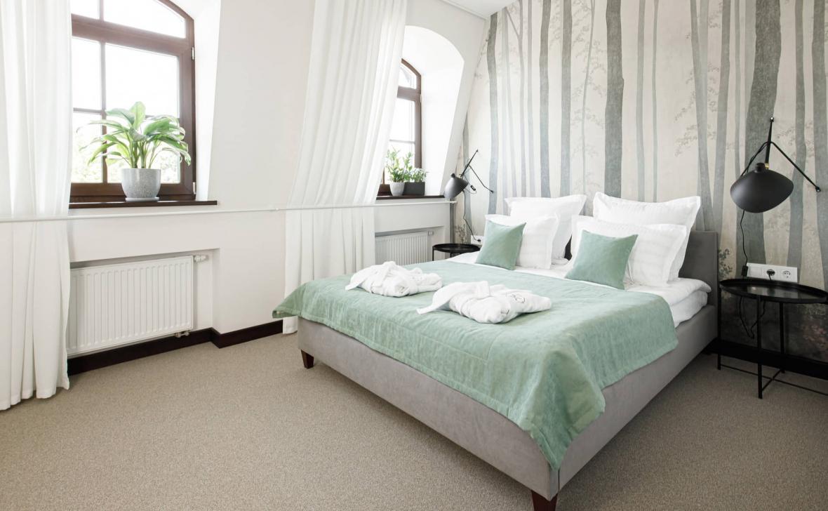 Спальня, без сомнения, считается самой личной комнатой в доме. Это особое место, где присутствуют безмятежность, умиротворение и любовь. Вся атмосфера здесь настраивает на отдых. Геометрические линии функционально разграничивают пространство. Уютный балдахин создает атмосферу приватности, спокойствия и добавляет в интерьер нотку романтики. В оформлении этого номера мы использовали ментоловые оттенки, которые способствуют расслаблению и восстановлению сил. Мы постарались создать уединенное пространство, где Вам непременно захочется остаться.