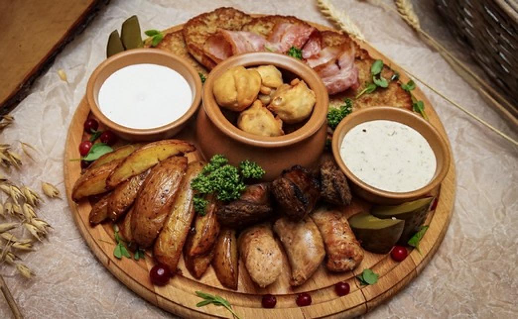 - картофель по деревенски дольками и бульбяники - пирожки из картофельного пюре, а также сметана и соус тар-тар