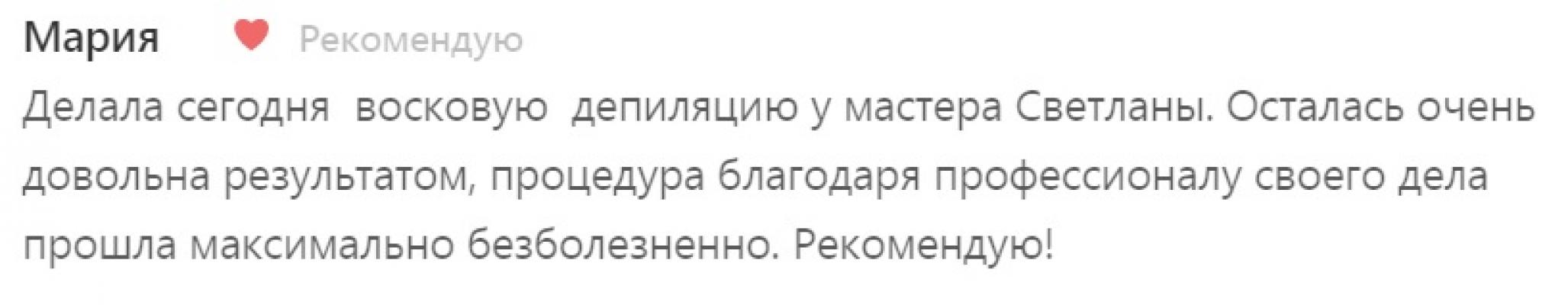 В нашем салоне работает опытный специалист по депиляции Светлана (опыт работы более 10 лет). Высокая скорость, бикини не более 20 минут, качество работы и лучшие материалы, воск «Depilflax» обеспечат превосходный результат и минимум дискомфорта. Раз - мастер наносит разогретый воск на тело, два - лишние волоски удаляются вместе с корнем. И никакой аллергии, порезов и ожогов!