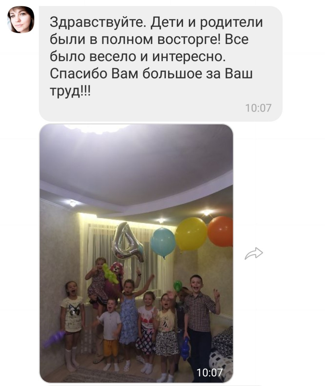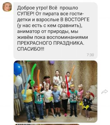 Заказывали Пирата дочке на 10-летие (06.10.2019), все просто в восторге!!! Пират - настоящий профессионал своего дела! Настроением зарядил всех - и детей и взрослых, хотя задача стояла не из легких - дети были разных возрастов (от 4 до 12 лет) и развлекательные программы уже видели разные). Дополнительно заказывали шоу мыльных пузырей - всем тоже очень понравилось!!! Спасибо Вам огромное за Ваш труд!!!