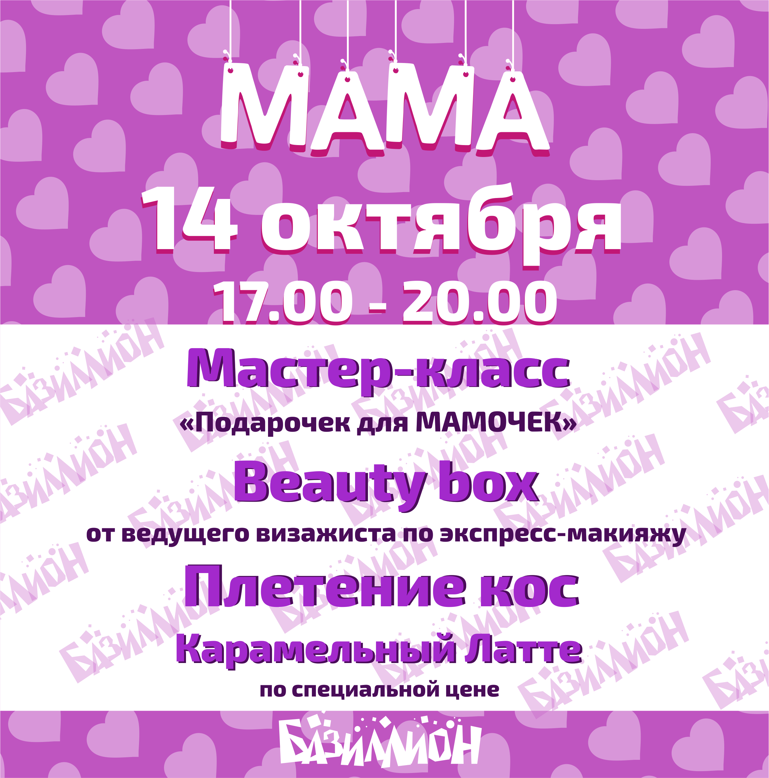 Приближается один из самых трогательных праздников в году - День мамочек! И мы решили этот день сделать для мамочек наших маленьких посетителей ярким и незабываемым! Только в этот день самый вкусный и волшебный Латте по специальной цене, Beauty box от ведущего визажиста по экспресс-макияжу, где вы сможете в лёгкой и непринуждённой обстановке освоить секреты красоты.💄👄👠 А также, плетение кос!💆💇🎀 Это не только для наших малышек популярно, но и очень модно и актуально для мамочек. Мастер-класс, где малыши сделают своими ручками миниатюрные подарочки для вас! Мы вас очень ценим и всегда рады видеть в нашем центре!и не только в праздничные дни;)