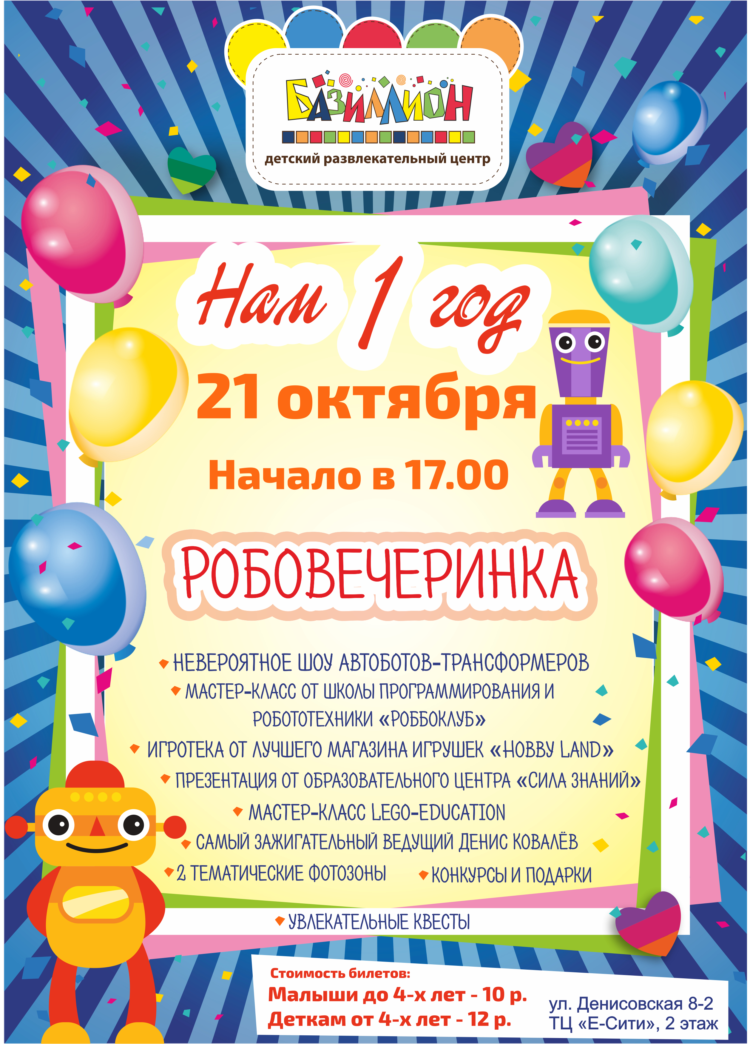 Добрый день, наши дорогие! Детский центр БАЗИЛЛИОН отмечает 1год!!!📽🎈🎊😅 Мы очень волнуемся! Уже начались самые приятные хлопоты по подготовке к этому мероприятию🎞🎥А пока вы ещё размышляете, присоединиться к нам или нет, мы немного расскажем про наш праздник🙌🏻 21 октября в 17-00 мы приглашаем всех-всех-всех на самую фантастическую вечеринку этой осени! Вас ждёт шоу автоботов - трансформеров, игротека, презентация, мастер-класс, 2 тематические фотозоны, квесты, самый зажигательный ведущий Денис Ковалёв, а также конкурсы и подарки.✌ Спешите приобрести билет📲+375(33)376-88-77 ТЦ "Е-СИТИ" ул. Денисовская, 8-2, 2-ой этаж, с 10.00 до 22.00, вт 12.00 - 22.00