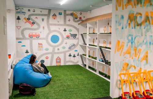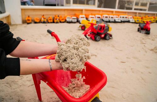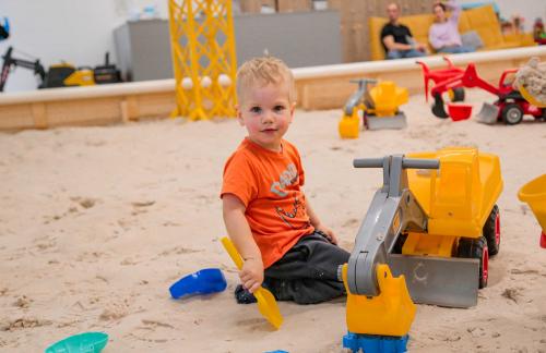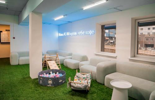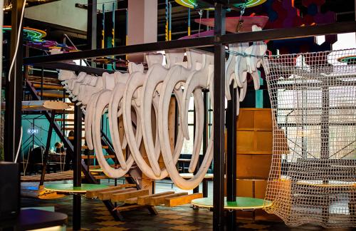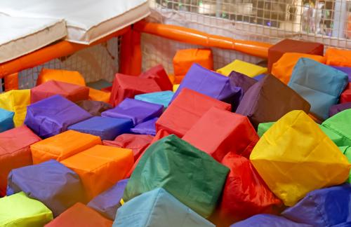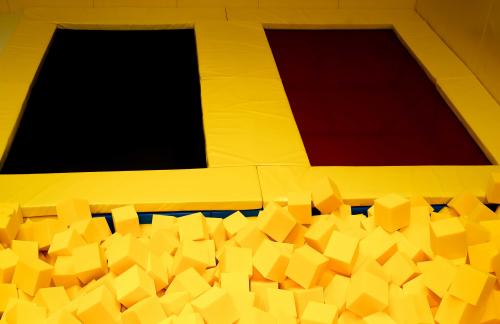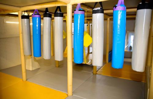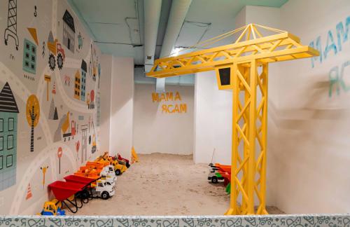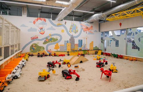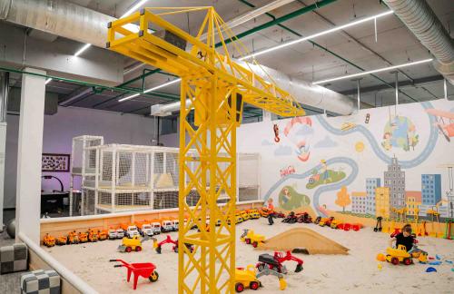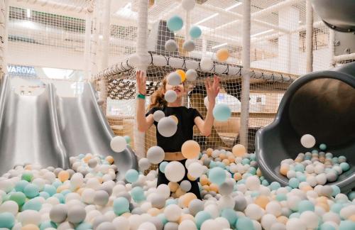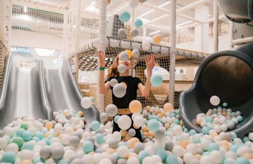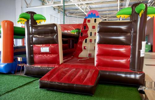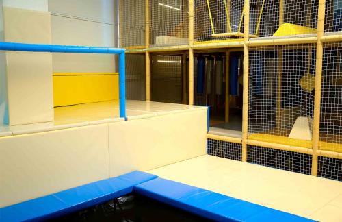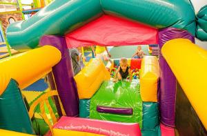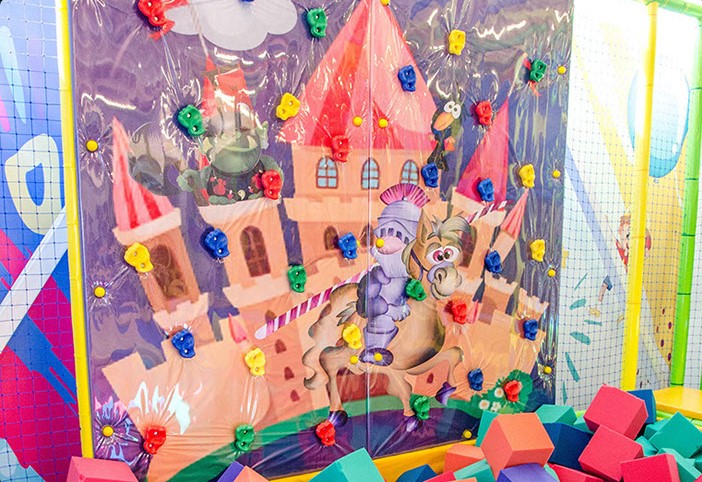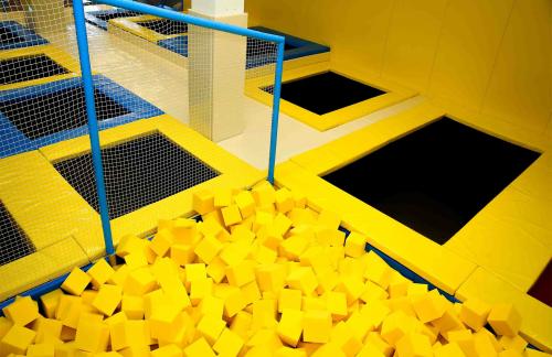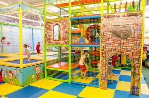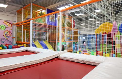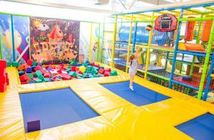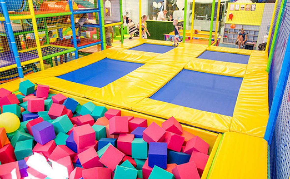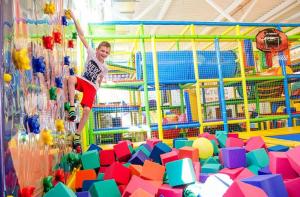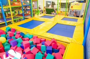 Детский центр с батутной ареной и поролоновой ямой со скалодромом, лабиринтом "Мармелад", сухими бассейнами с горками и надувным батутом "Домик" в кидсзоне.