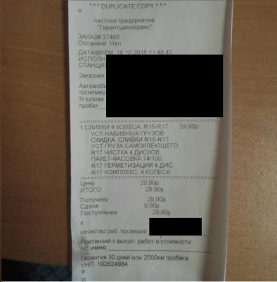 Теперь о качестве: переобувка 1.5 часа., Балансировка с погрешностью 5 грамм, все 4 колеса., Навязывали герметик!!! Что в принципе вообще не обязательно если у вас не квадратные и ржавые колеса...., Попросил откручивать и закручивать колеса в ручную, так как от пистолета бывают последствия, никто не прислушался, все равно сделали по своему...