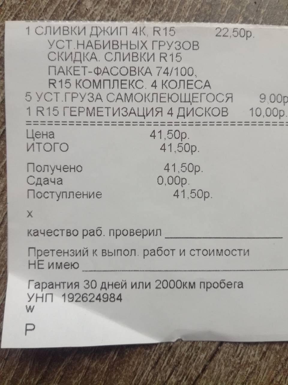 Сервис по белорусски или проще развод. Поехал сюда, т.к. был рядом, жаль не почитал отзывы, с телефона было неудобно. Переобувал 4 колеса 15-х, в условиях акции 20р., в чеке 22.5р с каких пор шкода фабия стала считаться джипом? Далее обмазка герметиком, то что по сути должно входить в комплекс работ, ну да ладно, в условиях акции прописано 2р за колесо,в чеке 10р, с каких пор у меня в машине стало 5 колес? Итог 41.5р + 1.5р купон. За 43 рубля я переобуюсь на любом шиномонтаже без всяких сливок. А вам "успехов и процветания".