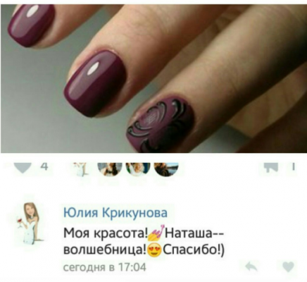 Спасибо, за замечательный маникюр, долговременное покрытие, атмосферу общения и супер мастера,Наталью!))) Теперь, я ваш клиент! + огромный выбор цветов лаков ! Нет очередей и спешки, все в назначенное время.