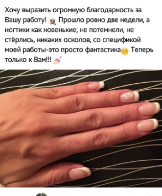 Добрый день! Делала маникюр с покрытием гель-лаком у Натальи две недели назад. Ногти были после наращивания в очень плохом состоянии. Мастер посоветовал сделать укрепление пудрой. Процедурой осталась довольна!!! Обработка ногтей качественная. Даже через две недели ногти в идеальном состоянии. Плюс палитра цветов лаков очень разнообразная! Спасибо!