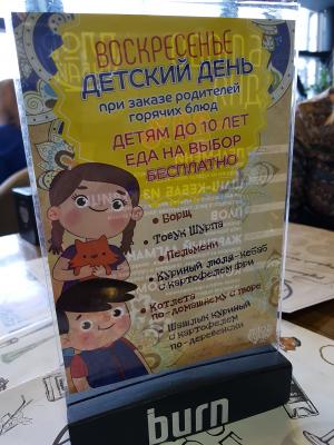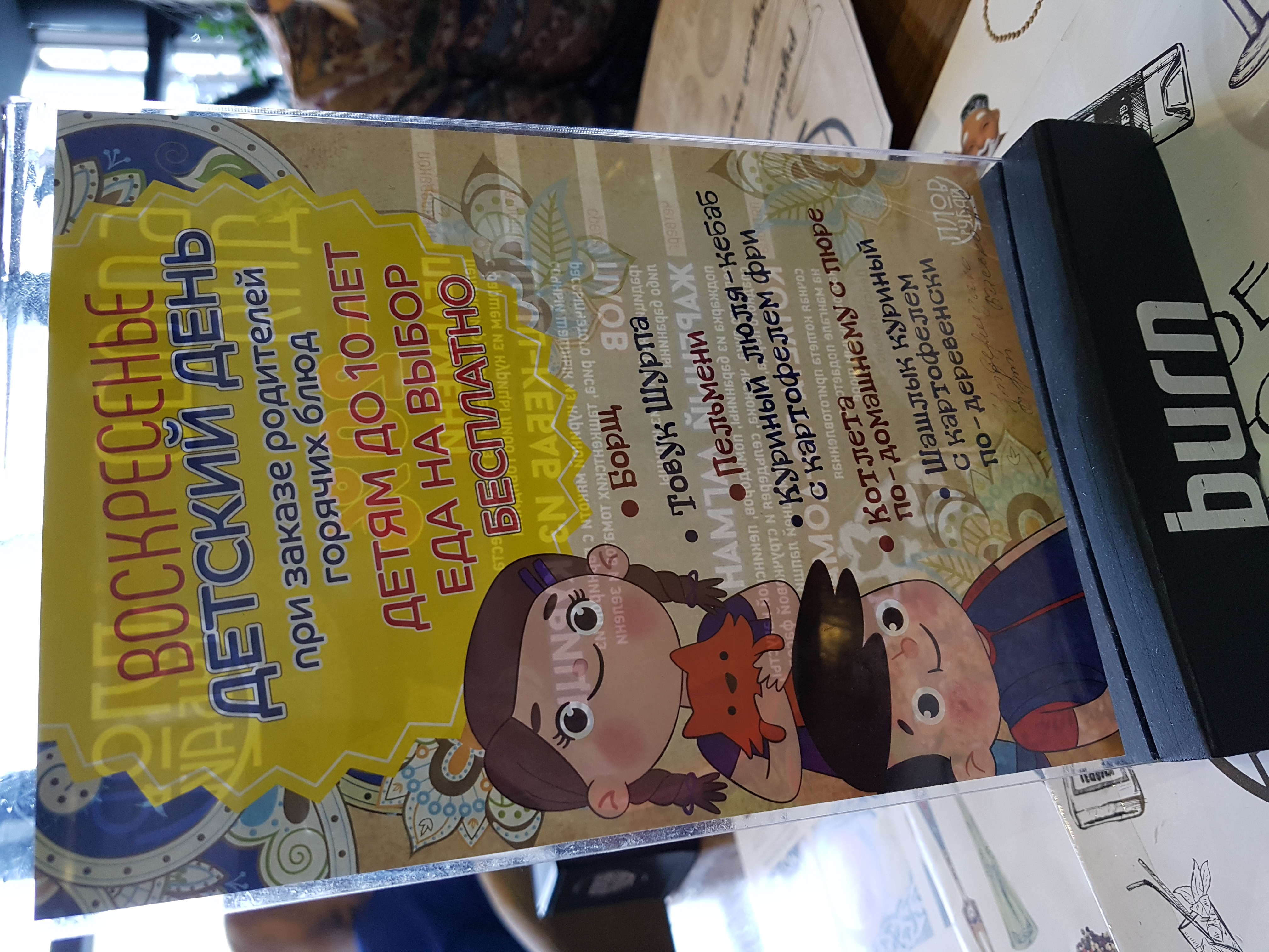 Отличное заведение. Кормят вкусно, большие порции, быстрое обслуживание. Были в выходной 9 марта - очень много людей, в основном иностранцы и гости столицы. Ну а теперь напишу о некоторых нюансах, которые стоит учесть администрации. Курящая и некурящая зона ничем не отделены, курят очень много (кальян, сигареты) и везде присутствует запах дыма. Это однозначно огромный минус, тем более если ты с ребенком (хотя в кафе есть детский день и соответственно акция - см фото). Соответственно минус звезда. Заведение большое и солидное, но если ты на машине - припарковаться негде. У огромного здания, как ни странно, нет своей стоянки. Нужно долго кружить в поисках места на улице, либо заезжать на платную на Зыбицкую - 7р за 1,5 часа. На стоянку журавинки не пускают. Еще минус звезда. Может быть для посетителей фудкорта можно как-то решить вопрос? Ну и под конец оказалось, что наши коды недействительны. Немного странно, т.к. из 4х кодов ранее были использованы только два. Пришлось брать новые. К сожалению, сегодня только 2 звезды.