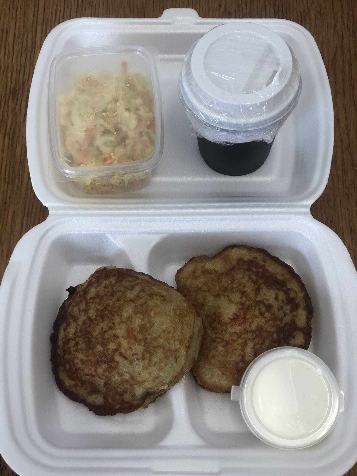 - №2 "Салат из пекинской капусты с курицей и гренками + суп-пюре + зраза рыбная + рис + напиток фруктовый" (920 г): 10,90 р. 15,30 р.