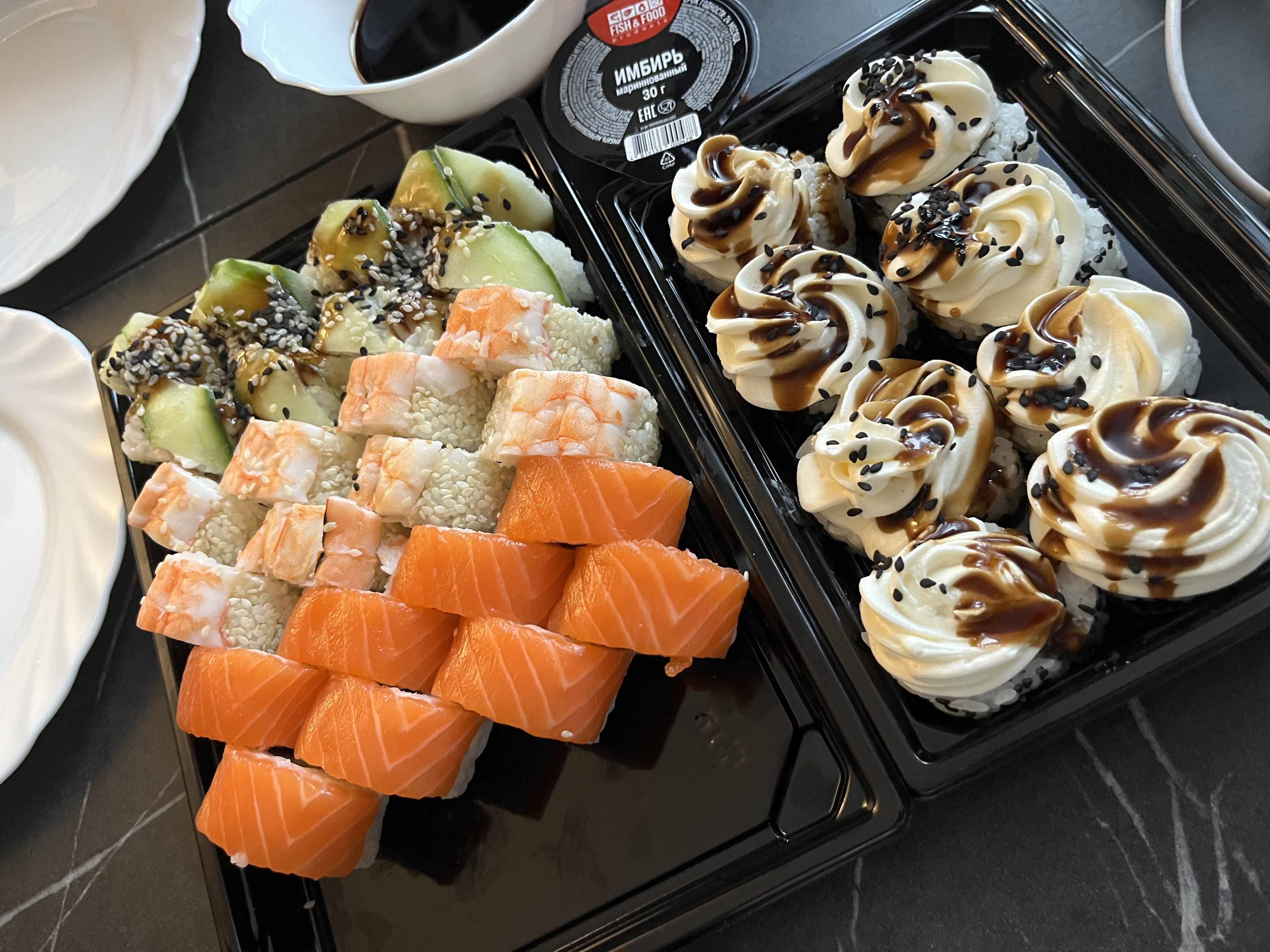 Суши вкусные, но вот работа адмтнистратора парня и курьеров - это грустная история. После онлайн заказа нужно самим звонить и говорить, что сделан заказ, чтобы они увидели заказ)) в прошлый раз курьер приехал с психами из-за того, что у него нету сдачи. Суши заказывали горячие, но привезли остывшие.