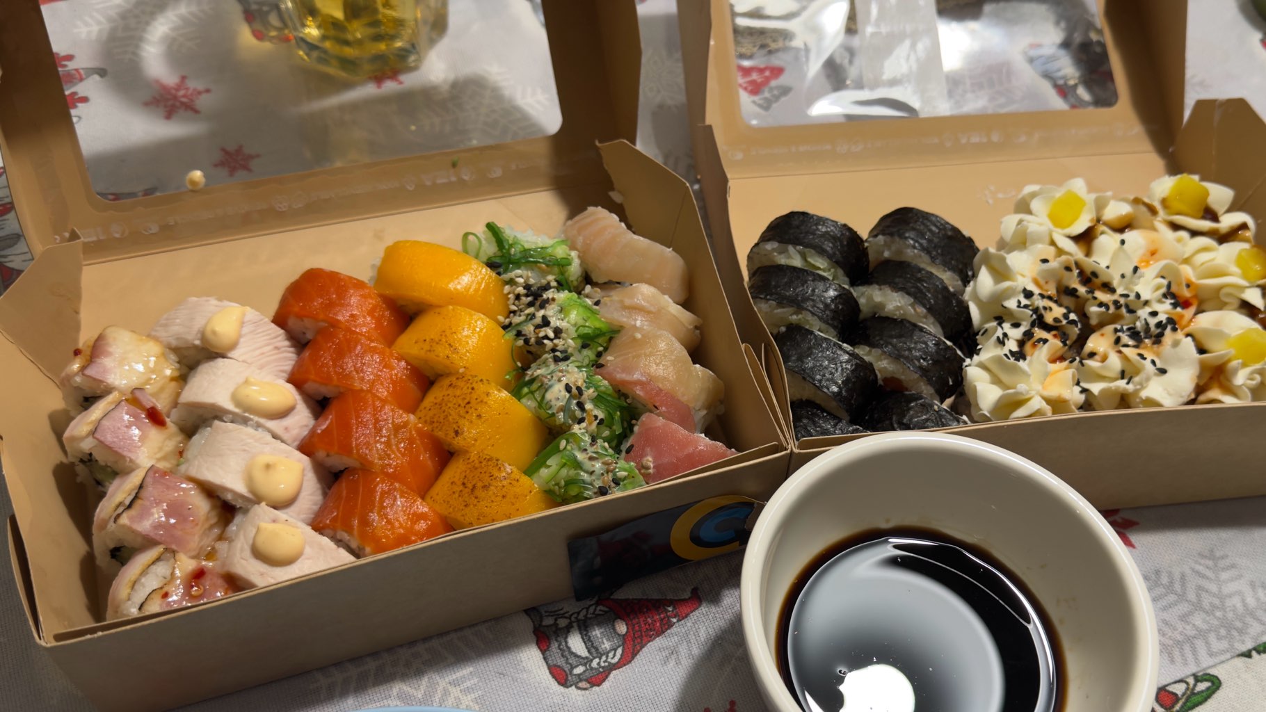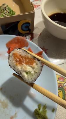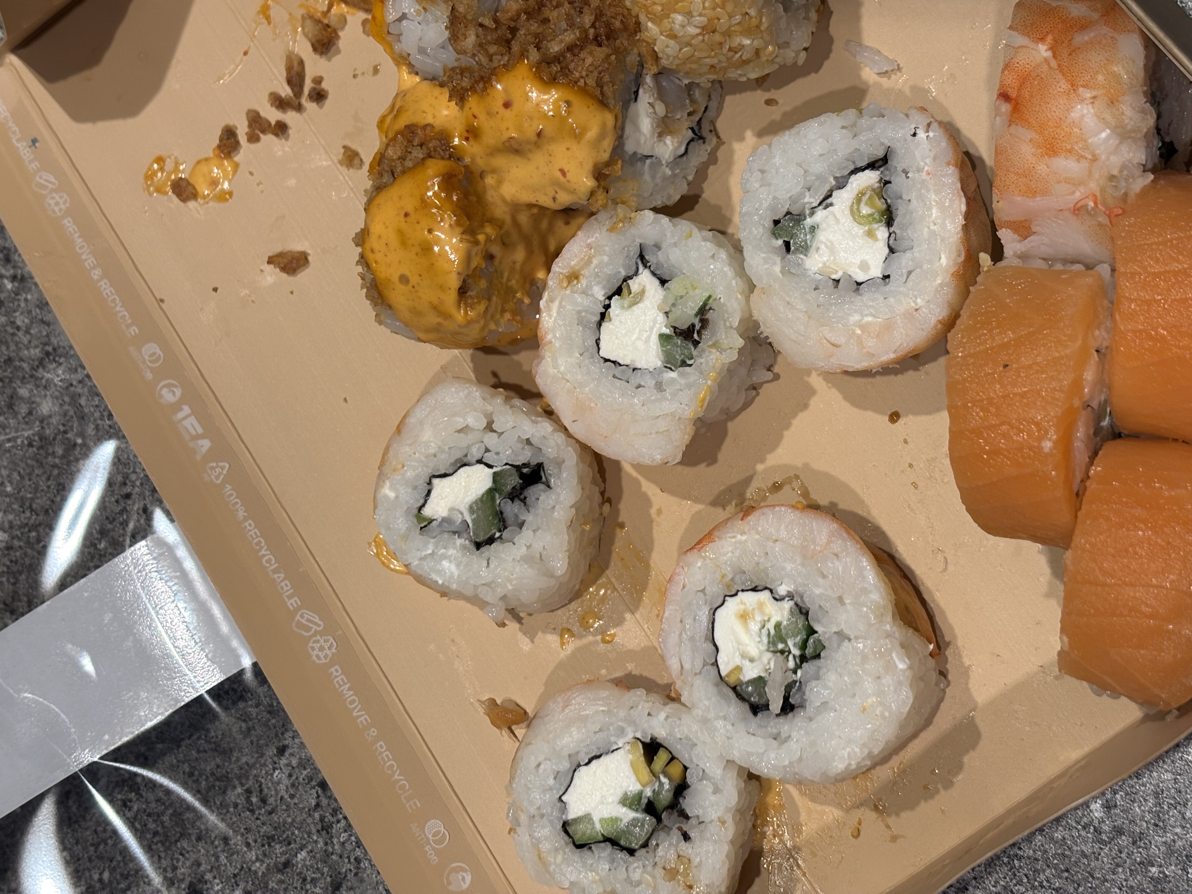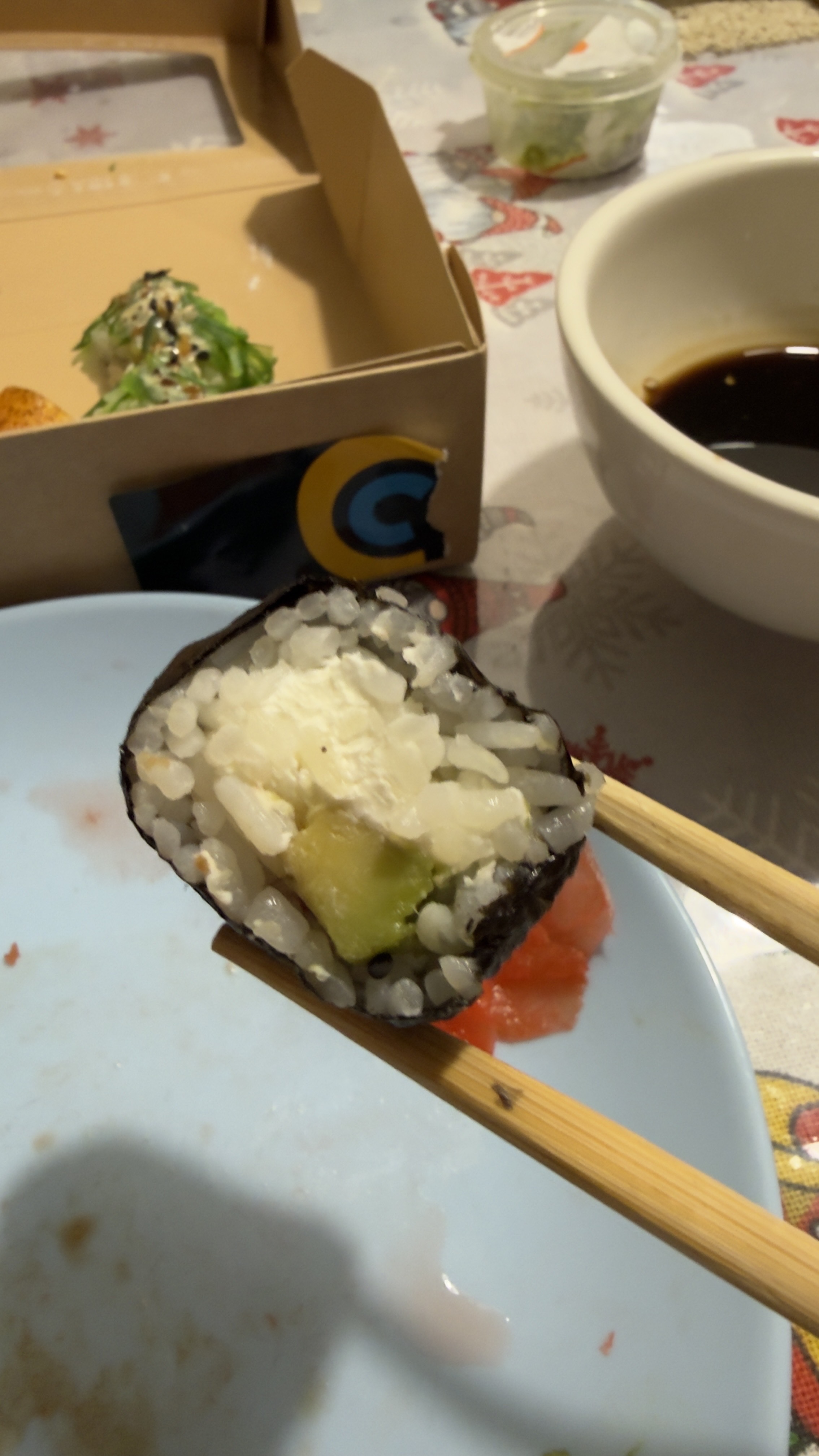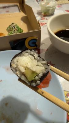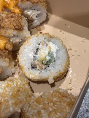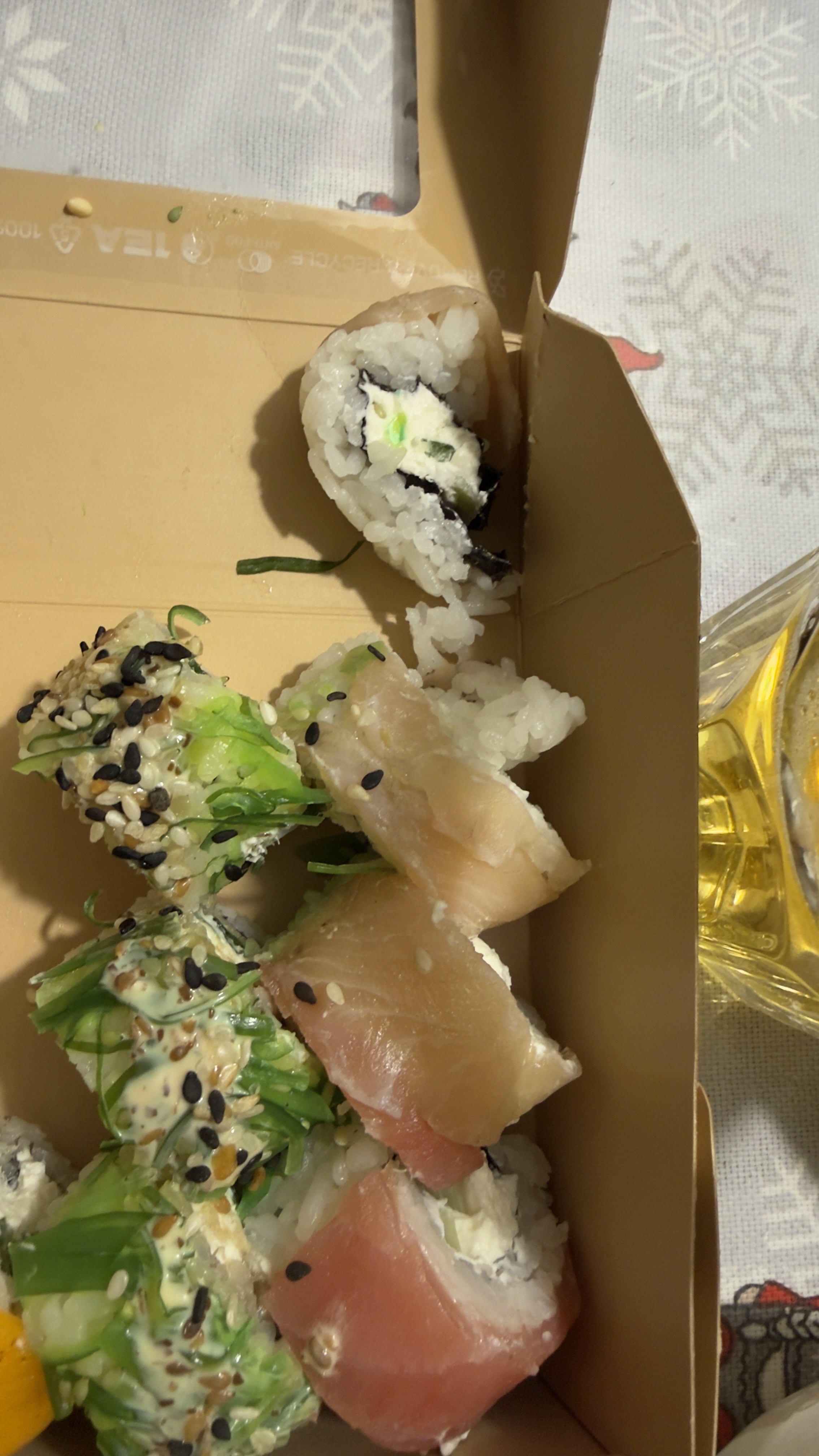 25.01 заказывали сет «анатолий доплатит» за 39 руб. Ожиданий конечно больших не было, но с каждым заказом всё хуже и хуже. Роллы с окунем - странный, не очень приятный фарш с косточками, ребенок подавился, хорошо что косточка не застряла в горле. Скручены плохо, половина разваливается пока достаешь из коробки. Рис вкусный, но из-за того что плохо скручено, разваливается в соевом. Обязательно 1 штука каждого вида будет пустая «попка», обычно такое обрезают, а не отправляют клиенту (2 последних фото, один и тот же кусочек с двух сторон).