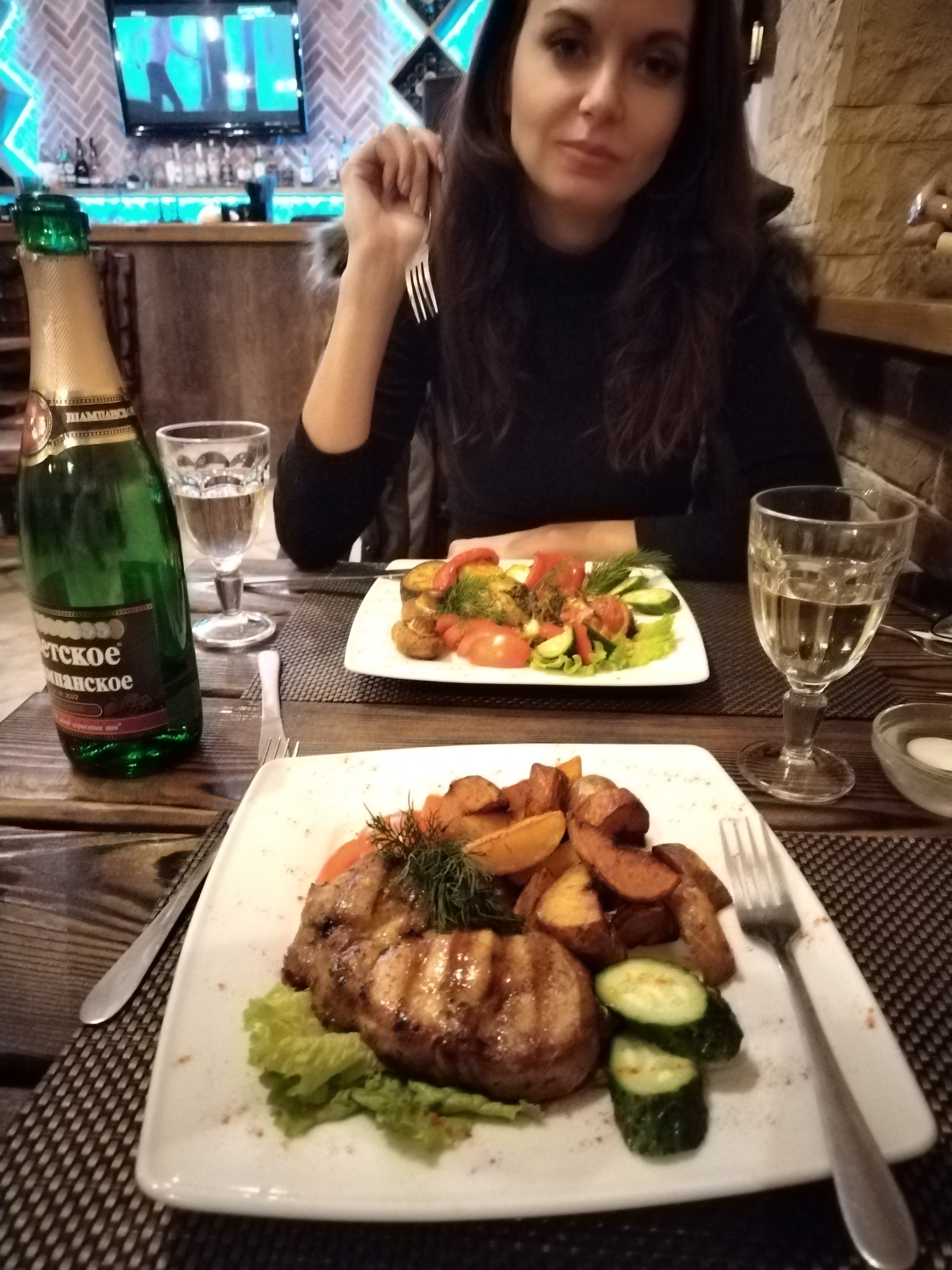 Ужин вкусный, горячее и салат, шампанское .