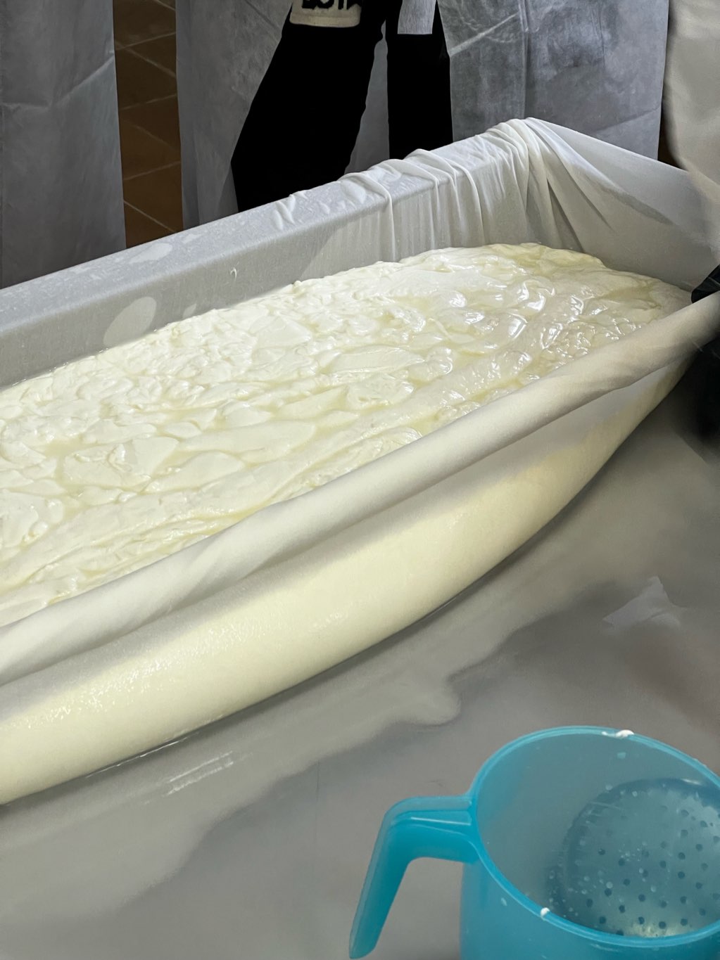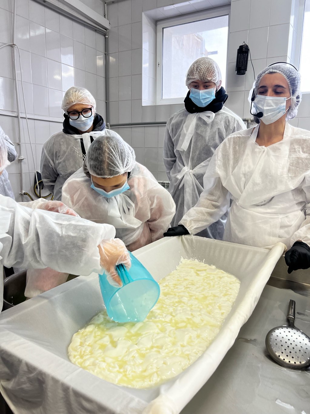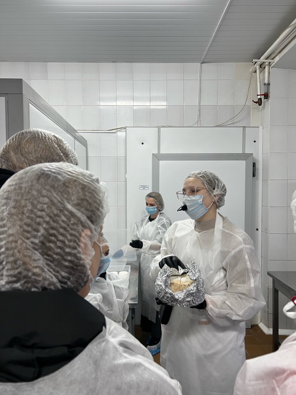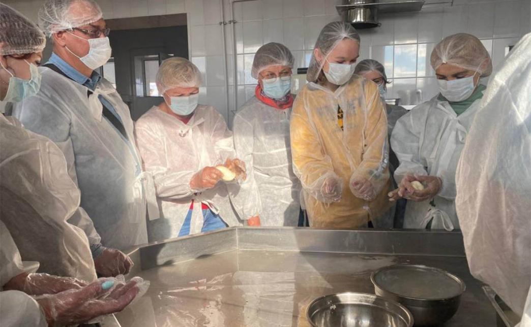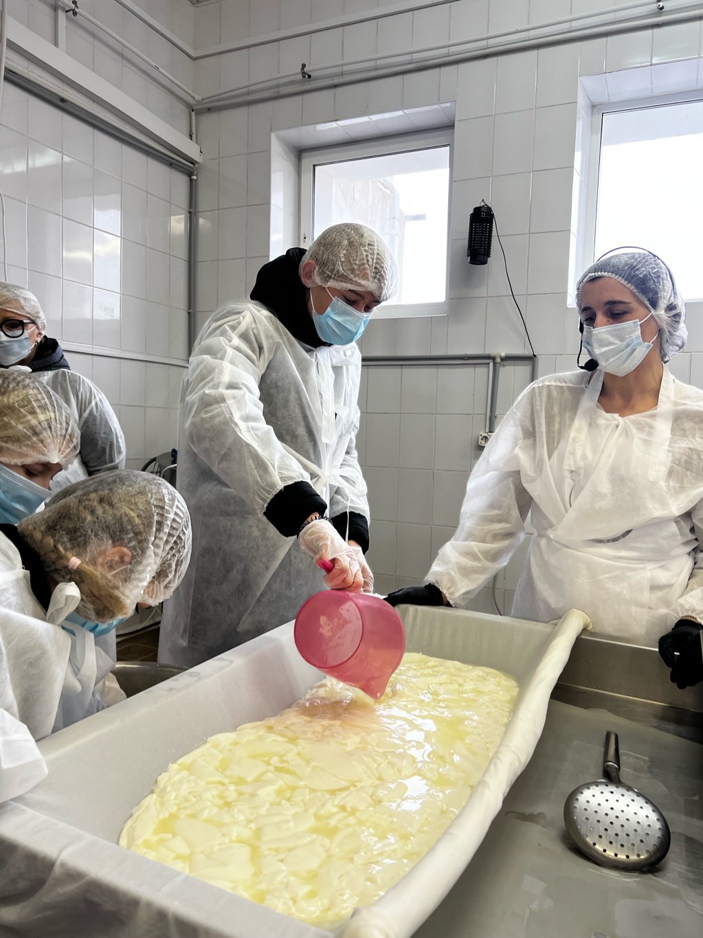 Мы переодеваемся в санитарную одежду, надеваем маски, шапочки, бахилы, халаты и перчатки и идем в цех. Там мы расскажем про все этапы изготовления сыра, покажем мастер класс по изготовлению мягкого сыра моцарелла. Сходим в камеру, где созревают наши сыры в естественных условиях.