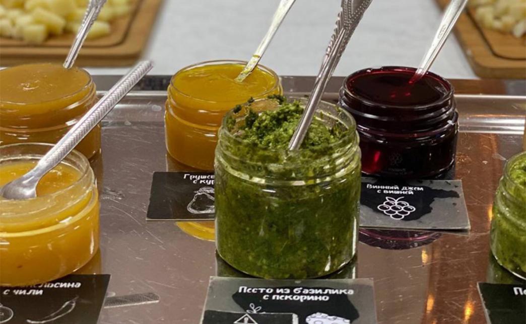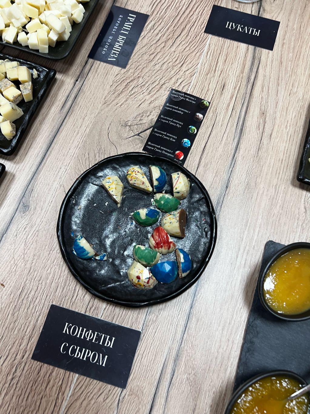 Снимаем санитарную одежду и идем в дегустационный зал. Там будут представлены все виды сыров и джемов, которые мы производим (от 6 видов сыра), а также шоколад собственного производства и горячие напитки (кофе и чай).