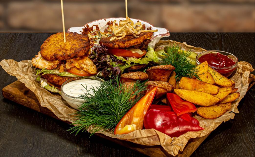 - "Дран Драныч" со свининой (330 г): драники, шея свиная маринованная, сыр, листья салата, огурцы маринованные, томат, соус барбекю