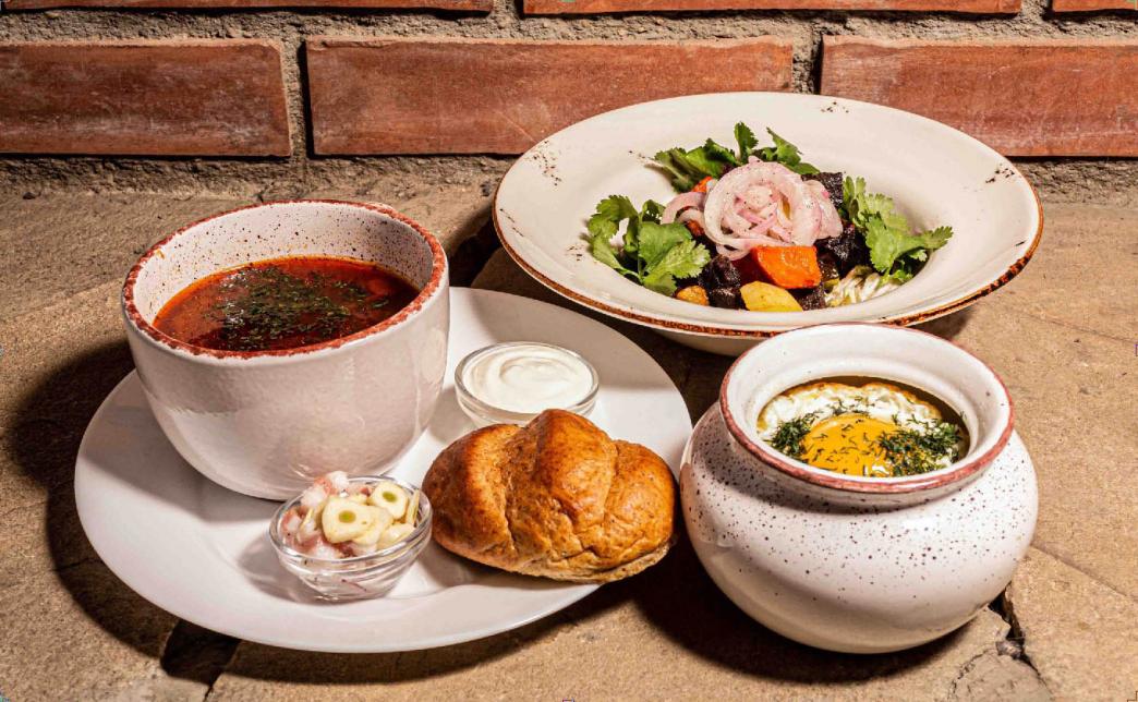 - борщ "Белорусский" (300 г) + хлеб (50 г) + сметана (50 г) + чеснок и сало (45 г): бульон мясной, говядина, картофель, свекла, томатная паста, томат, перец болгарский, капуста белокочанная, лук репчатый, морковь, чеснок, петрушка, укроп
