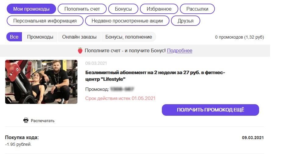 Здравствуйте! Приобрела промокод на акцию - 50% (2 месяца за 109 р.) Промокод должен был действовать до 1 апреля. Собиралась купить абонемент. Сейчас в личном кабинете с промокодами отображается другая информация : скидка 50% на 2 недели занятий.