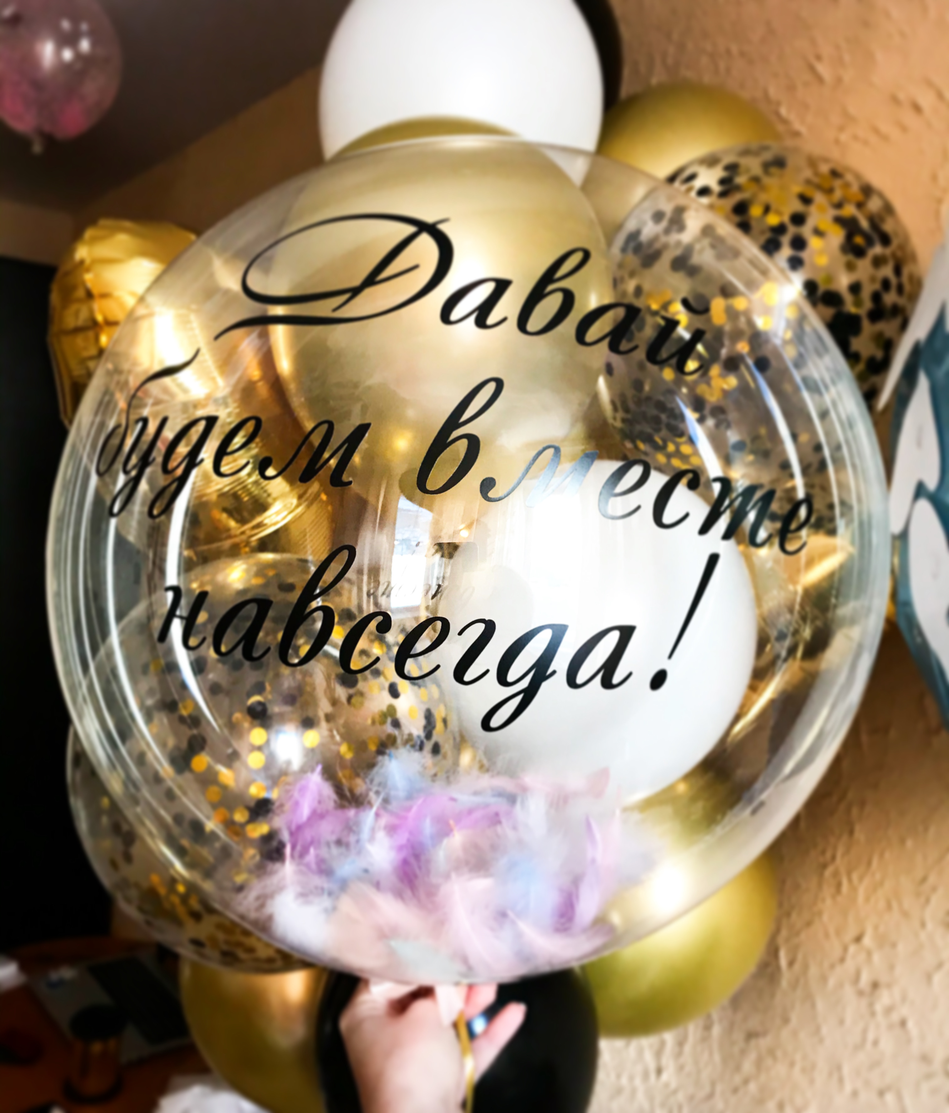 Наполнение шара по желанию: перья, конфетти 🎉, шарики малого размера, живые или искусственные лепестки цветов, денежные 💵 купюры.