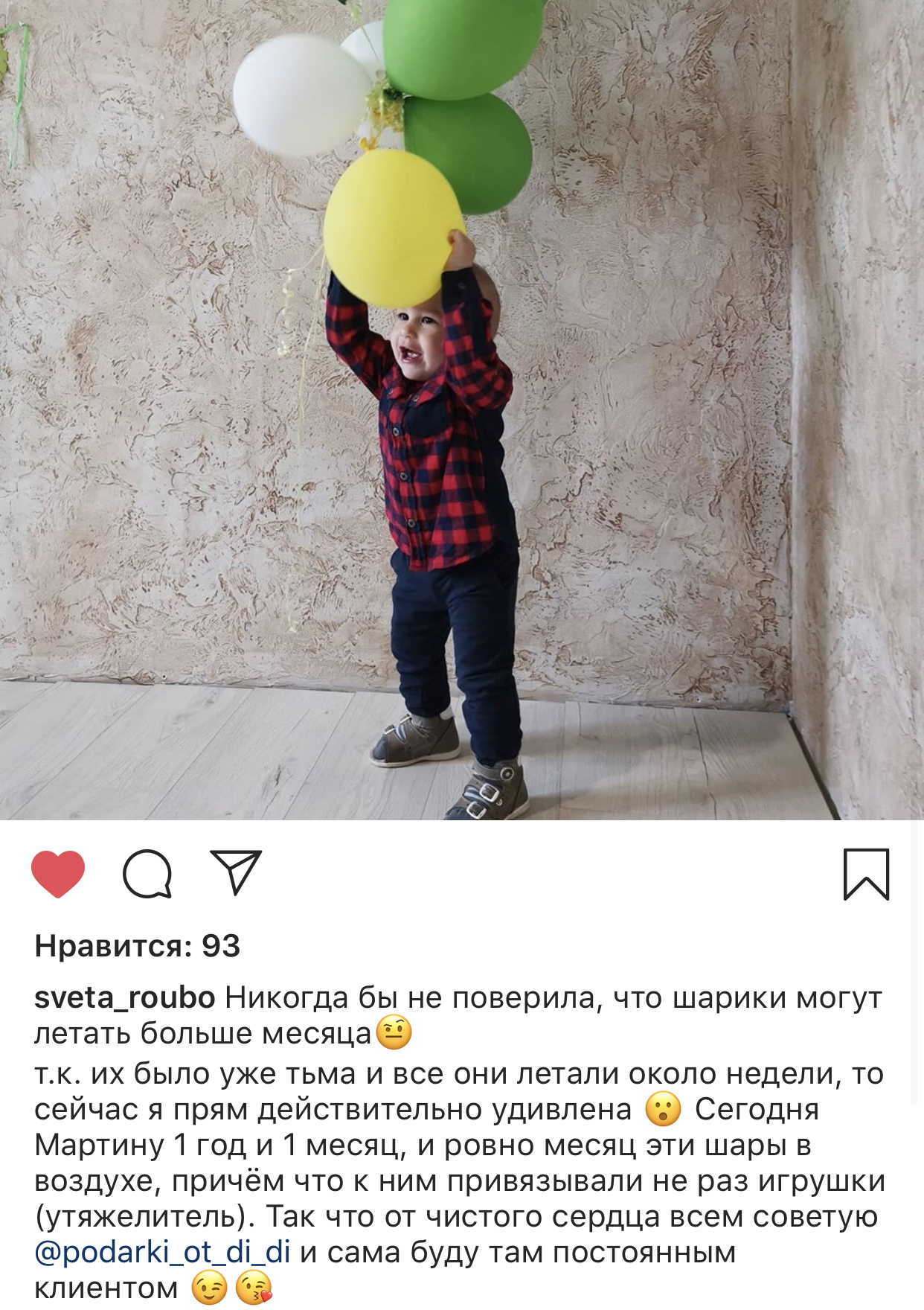 Три недели назад заказывала шарики и сама поверить не могу, шары до сих пор летают! Теперь буду заказывать только у вас! Спасибо большое!