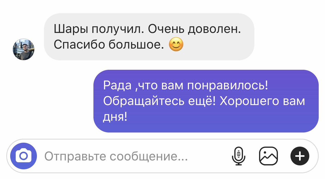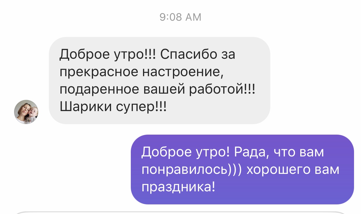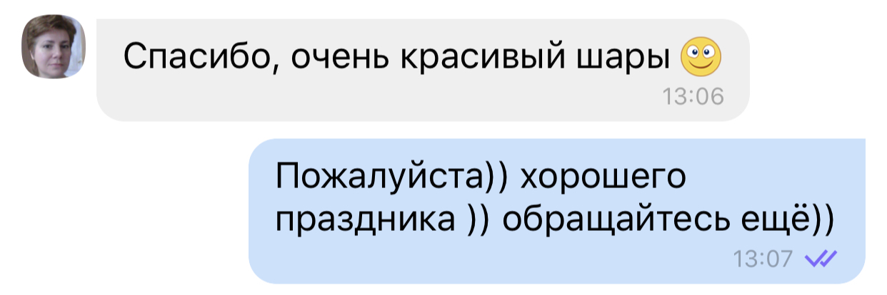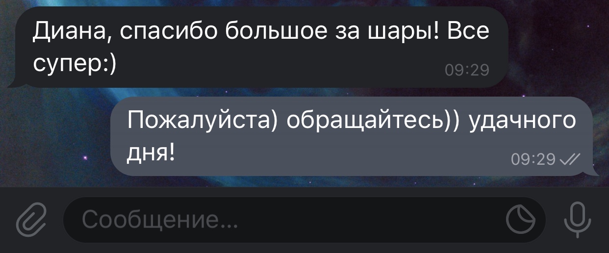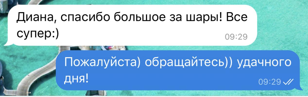 Уже не первый раз заказываю шары здесь, ни разу не подвели. Радует, что идут на уступки и делают доставку даже к 6.30 утра))) будем и дальше сотрудничать! Спасибо за хорошую работу!