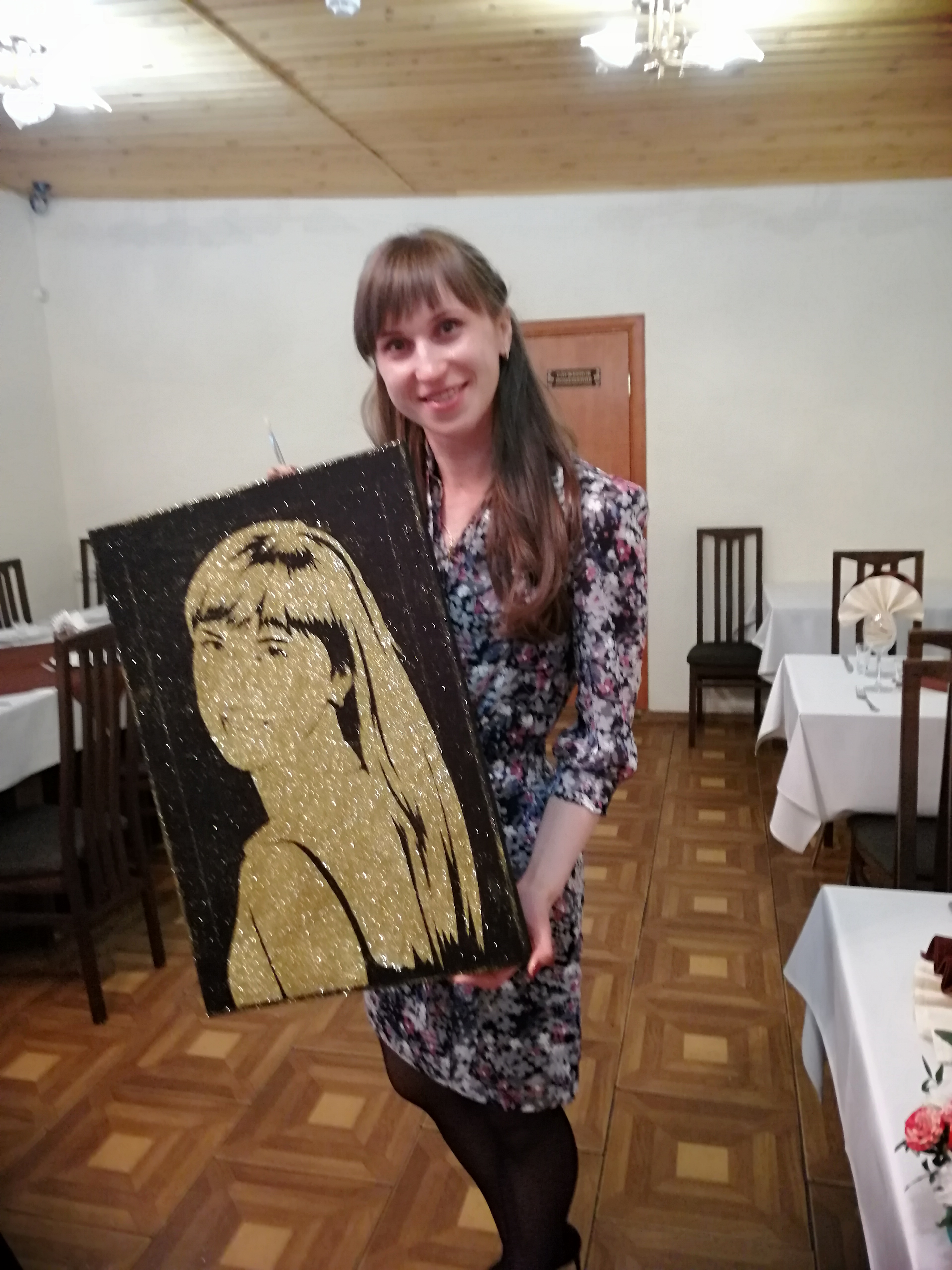 Ну вот наконец-то и у меня "дошли руки" написать о впечатлениях, подаренных командой Креатив Арт.Заказывала на юбилей подруги портрет и... Все по порядку: - сначала очень понравился макет и возможность выбрать цветовую гамму, но еще больше восторга и восхищения было на самом юбилее, когда каждый из гостей приложил свою руку в написании портрета. Именинница была растроганна до слез, гости счастливы от совместного творчества. СПАСИБО ОГРОМНОЕ!!!! А самое главное, теперь я как ведущая, предлагаю своим заказчикам вашу "изюминку" на их праздник.... И им то же нравятся ваши работы и они спешат сделать приятный подарок себе и своим близким и знакомым. А вот и портрет моей подруги. Ещё раз спасибо!!!