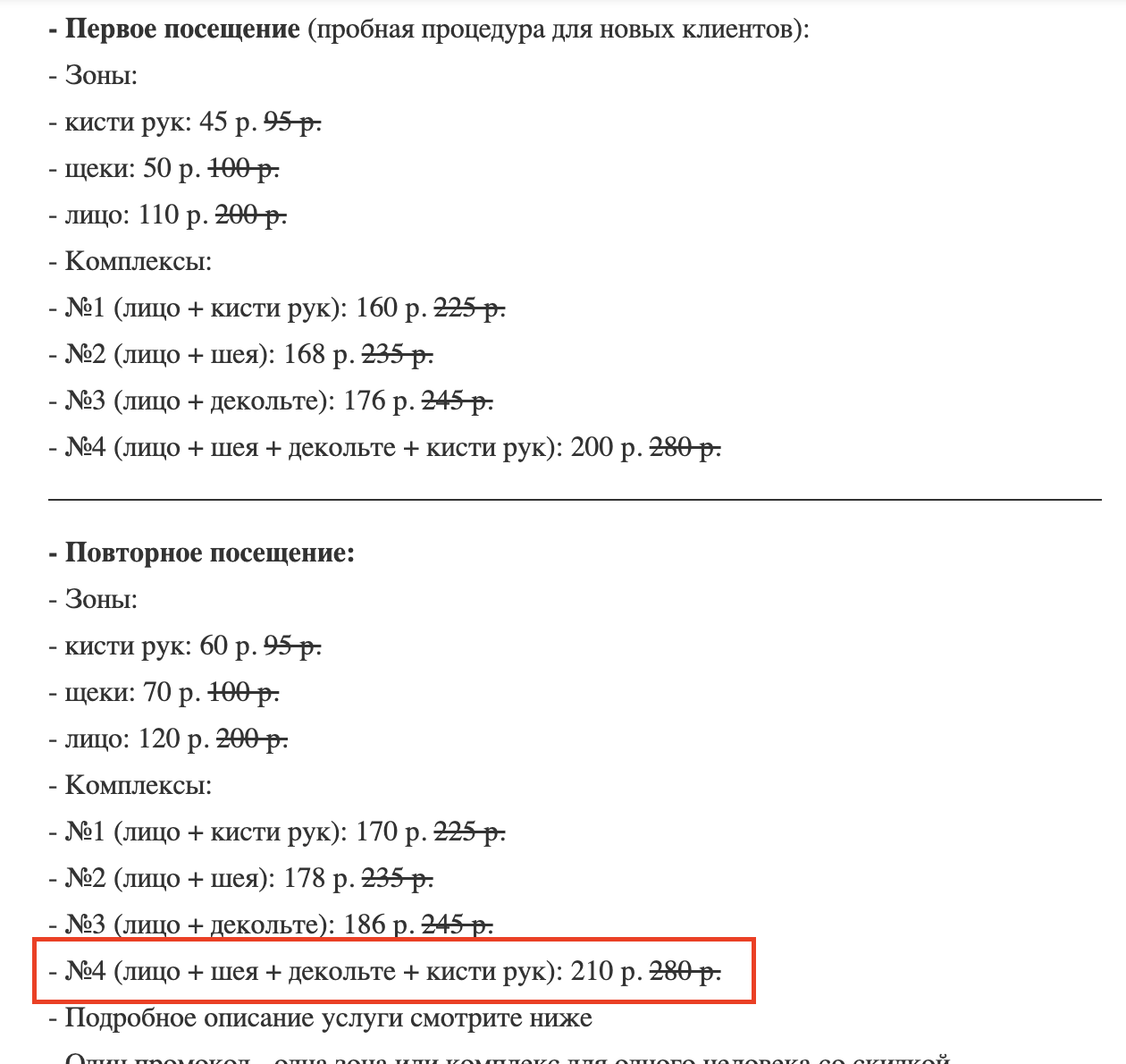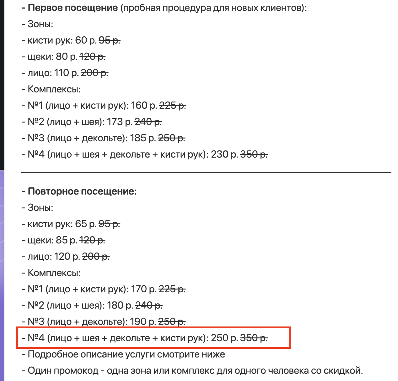 - №4 (лицо + шея + декольте + кисти рук): 250 р. 350 р.