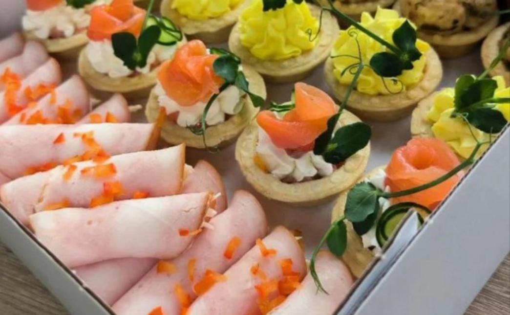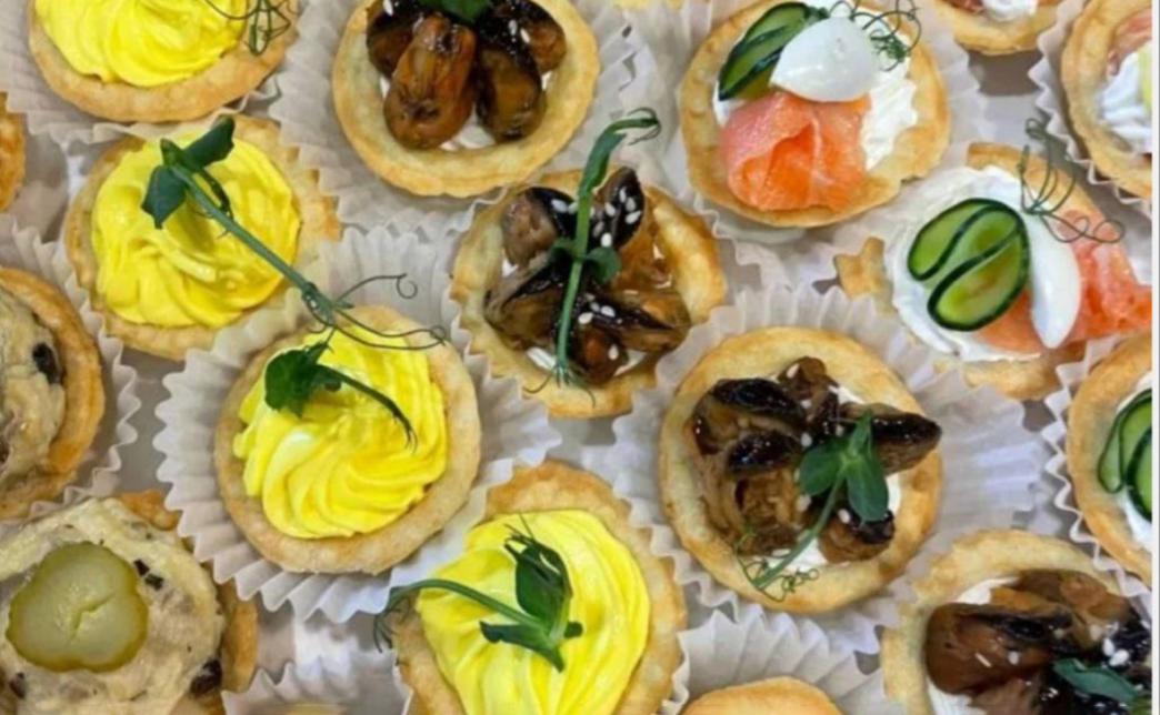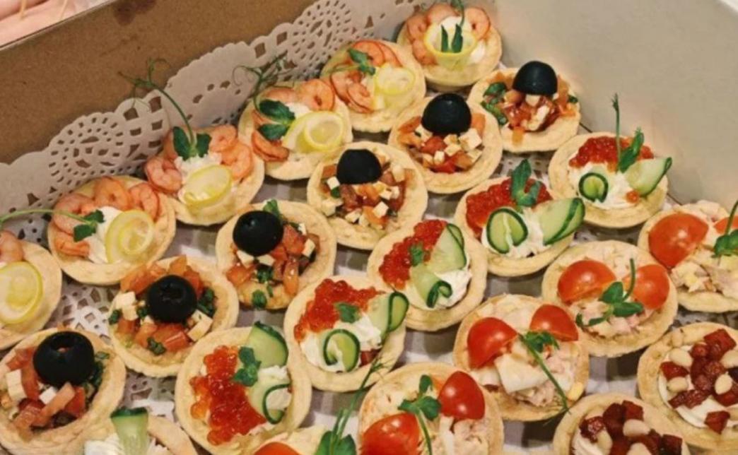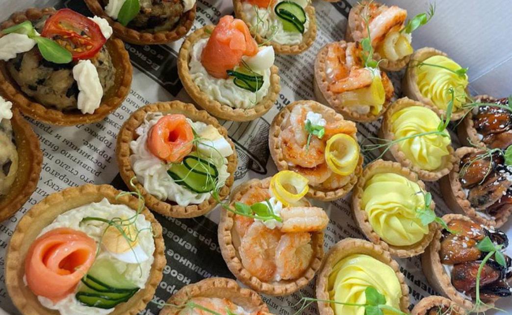 - фудбокс "Тарталетки": тарталетка с творожным сыром и креветкой, тарталетка с творожным муссом и мидиями, тарталетка с творожным сыром форелью и огурцом, тарталетка запеченная с курицей и грибами, тарталетка с сырно-яичным кремом - 30 шт.