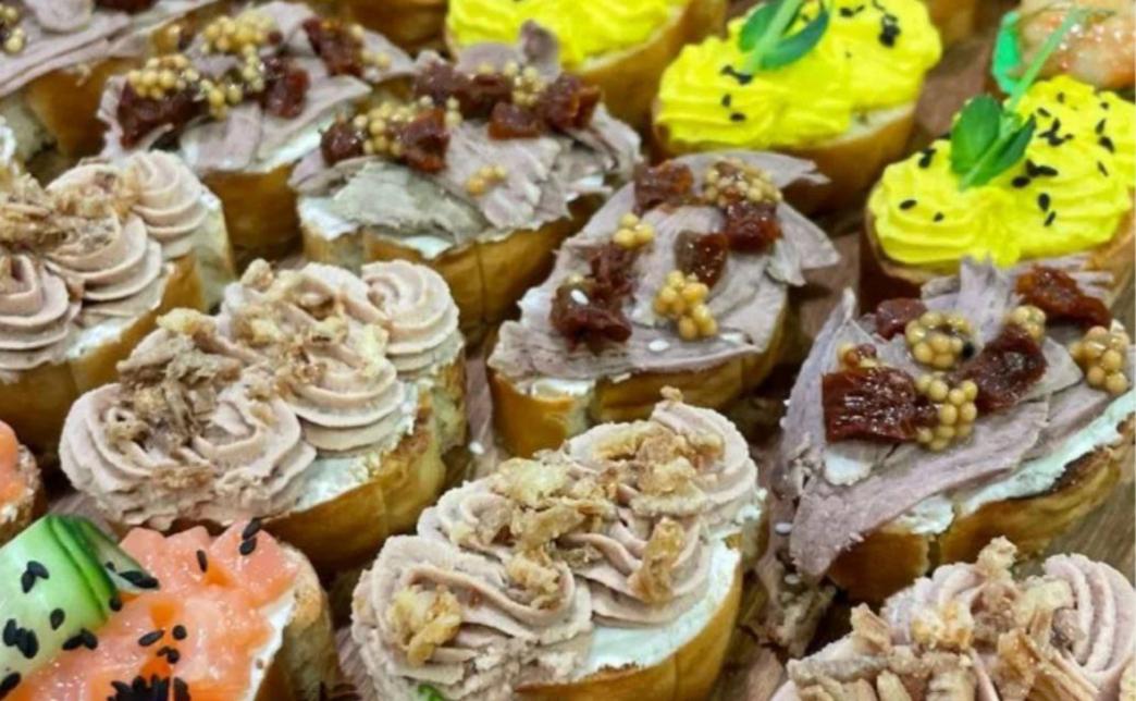- фудбокс "Под игристое": кростини с пассированными шампиньонами и творожным сыром, кростини с муссом из авокадо, королевской креветкой и томатом черри, кростини с сырно-яичным паштетом, кростини с паштетом (французский с яблоком) и жареным луком, кростини с бужениной (говядина), вяленными томатами, французской горчицей, кростини с слабосоленой форелью, творожным сыром и огурцом - 36 шт.