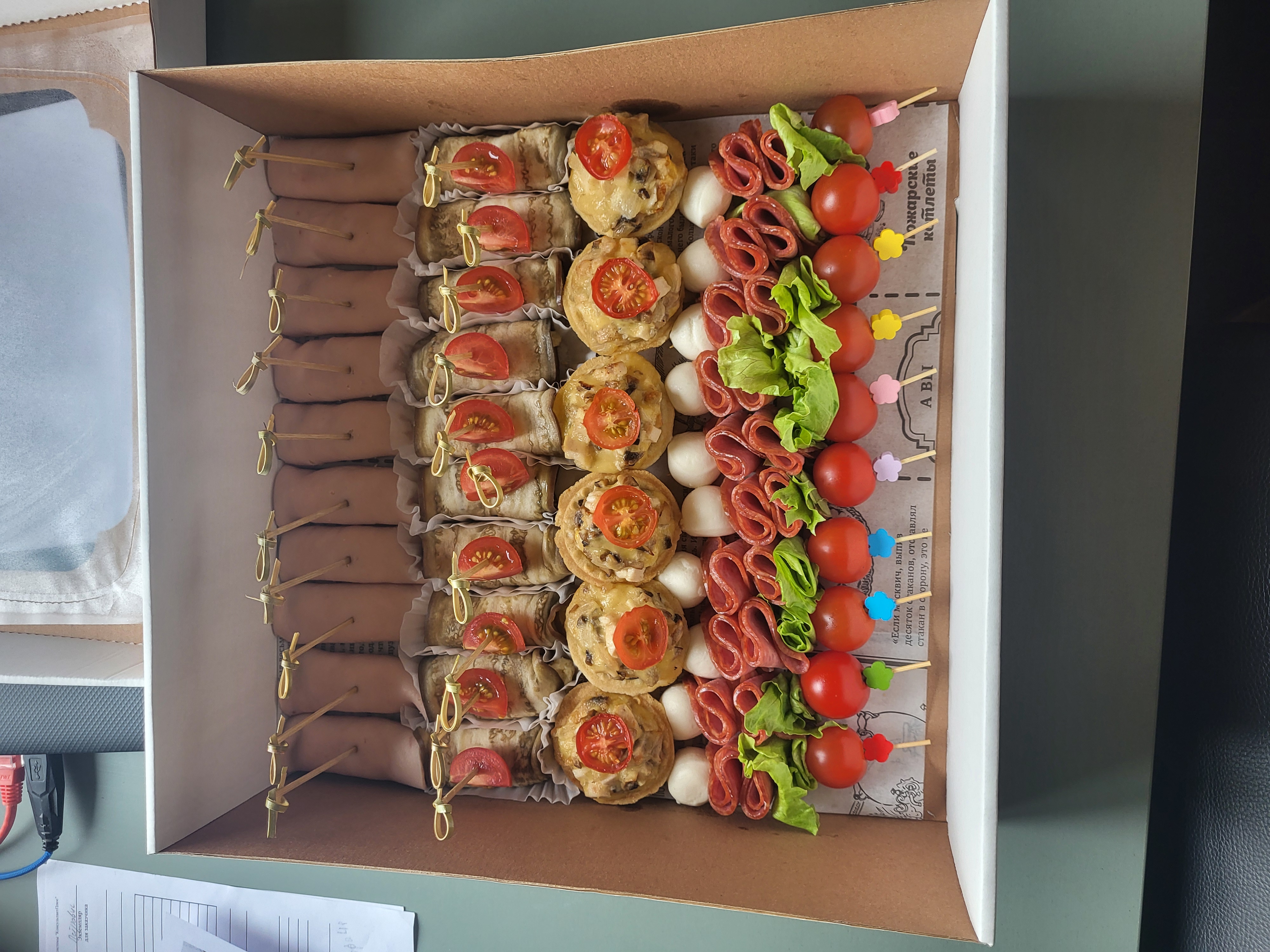 - фудбокс "Ассорти": рулет из ветчины, фаршированный сыром и грецким орехом, рулет из баклажана, фаршированный сыром и грецким орехом, тарталетка запеченная с курицей и грибами, канапе из томата черри, салями, салата, сыра моцарелла - 36 шт.