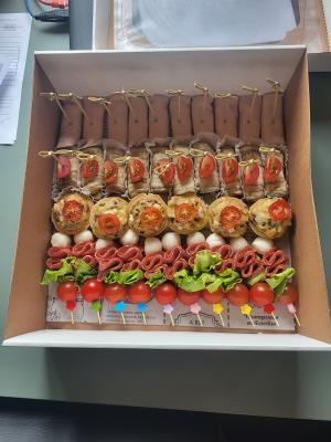 - фудбокс "Канапе": мини-сэндвич с ветчиной, томатом, твердым сыром, салатом, соусом, канапе из томата черри, салями, салата, сыра моцарелла, маслины, канапе из копченого сырного шарика, маслины, с/к колбасы - 30 шт.