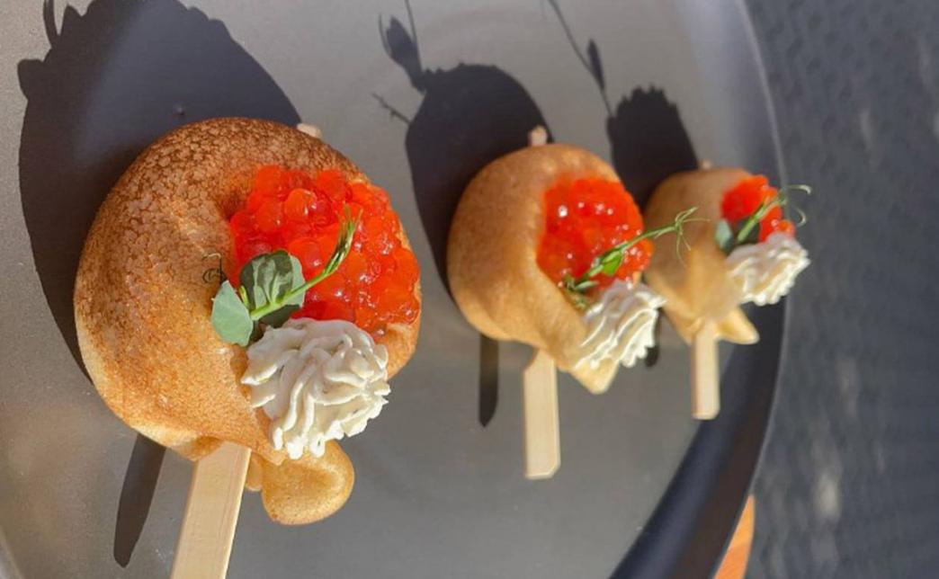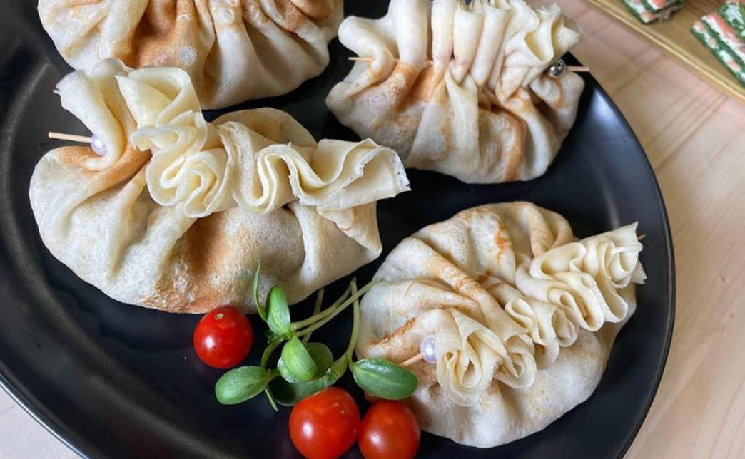 - фудбокс "Блинный": ролл "Улитка" с творожным сыром и икрой, мешочек с жульеном, рулет из лаваша с форелью, рулет из лаваша с ветчиной и сыром - 36 шт.