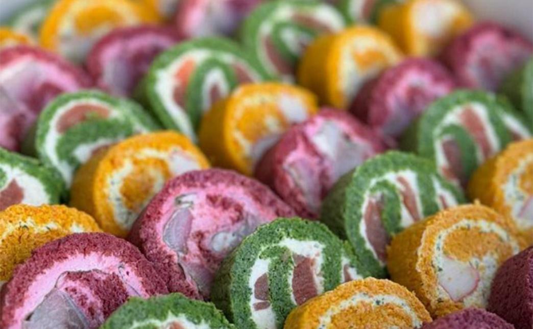 - фудбокс "Радужный": рулет из шпината с форелью, рулет из свеклы с сельдью, рулет из моркови с крабовыми палочками - 36 шт.