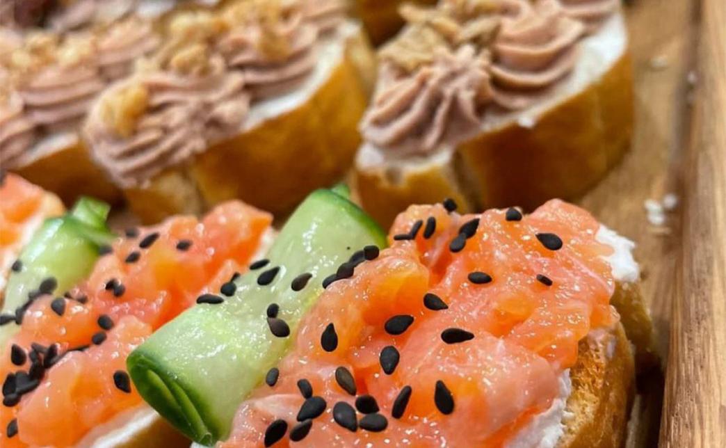 - кростини с слабосоленой форелью, творожным сыром и огурчиком - 6 шт.