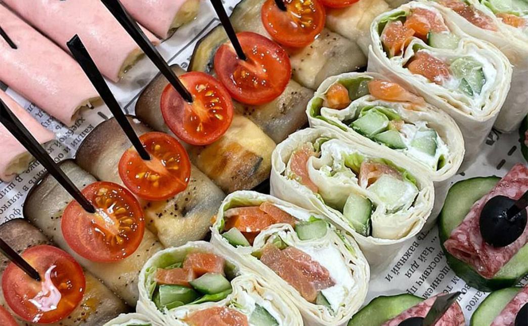 - фудбокс "Рулетики": рулетики из ветчины, фаршированные сыром и грецким орехом, рулетики из баклажана, фаршированные сыром и грецким орехом, томат черри - 40 шт.