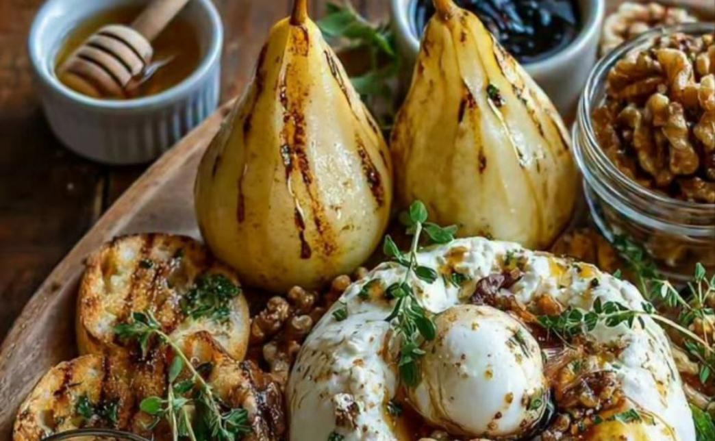 Состав сета: груша, брускетта, соусы, орехи, тимьян, буратта, сыр моцарелла