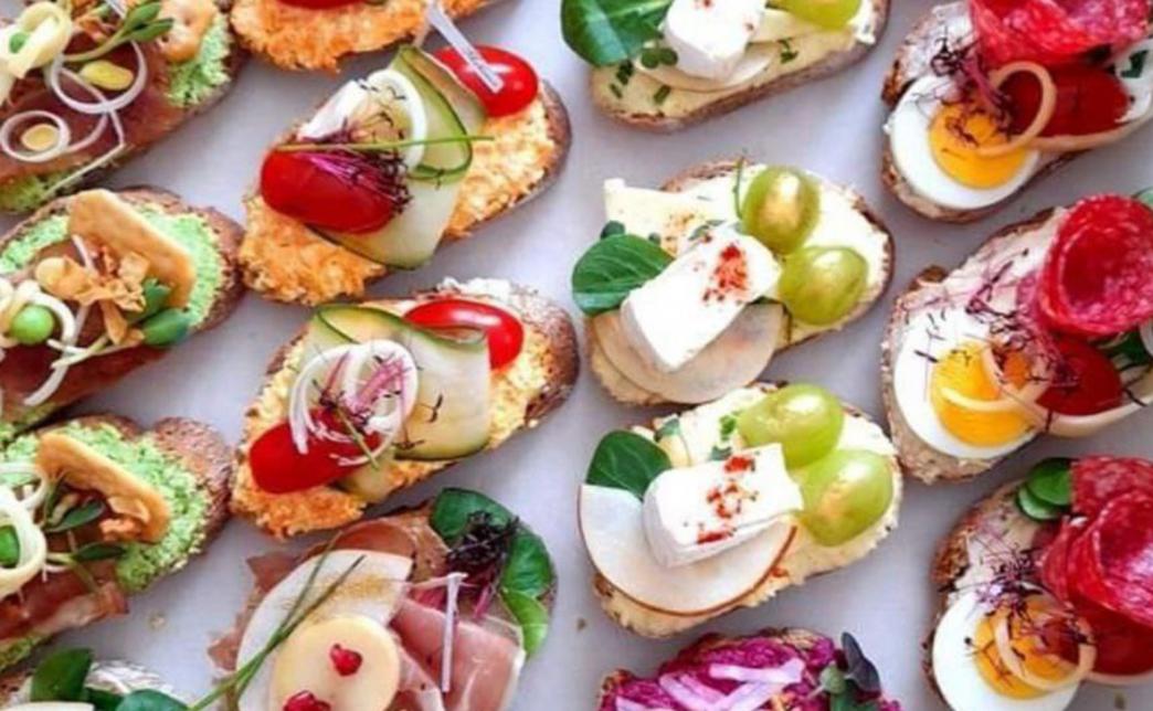 Состав: брускетты с вяленым мясом, сыром, томатами, клубникой, персиком, авокадо