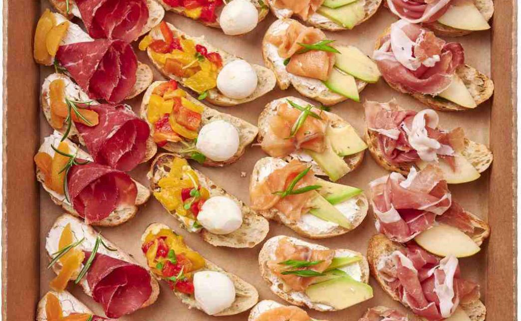 Состав: брускетта с абрикосами и ростбифом, брускетта со сладким перцем и моцареллой, брускетта с лососем и авокадо, брускетта с прошутто и грушей