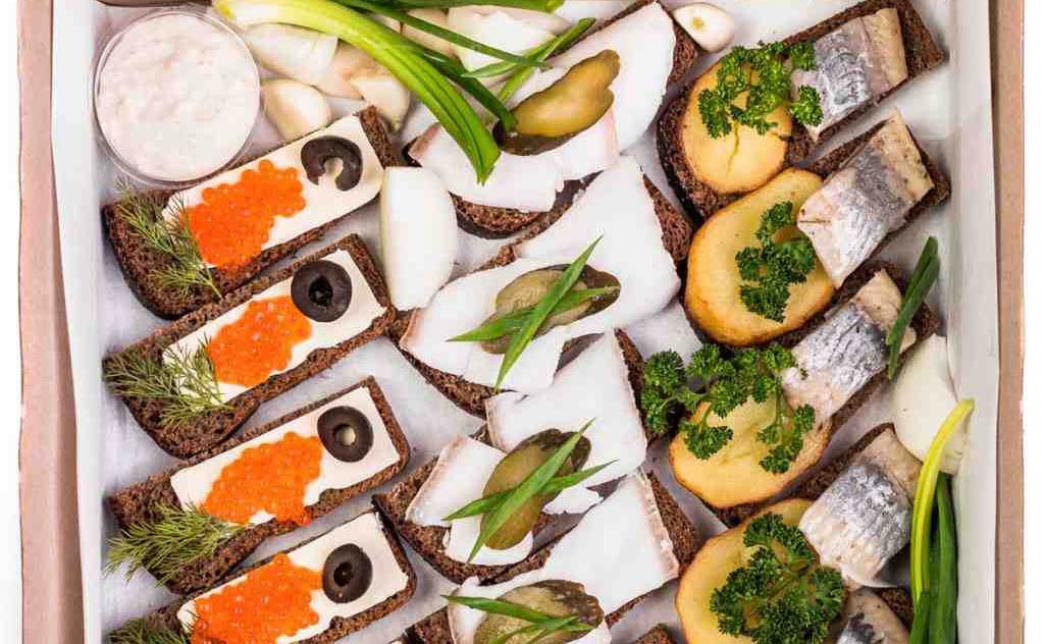 Состав: бородинский хлеб с маслом и красной икрой, бородинский хлеб с беконом и маринованными огурцами, бородинский хлеб с жареным картофелем и пряной сельдью