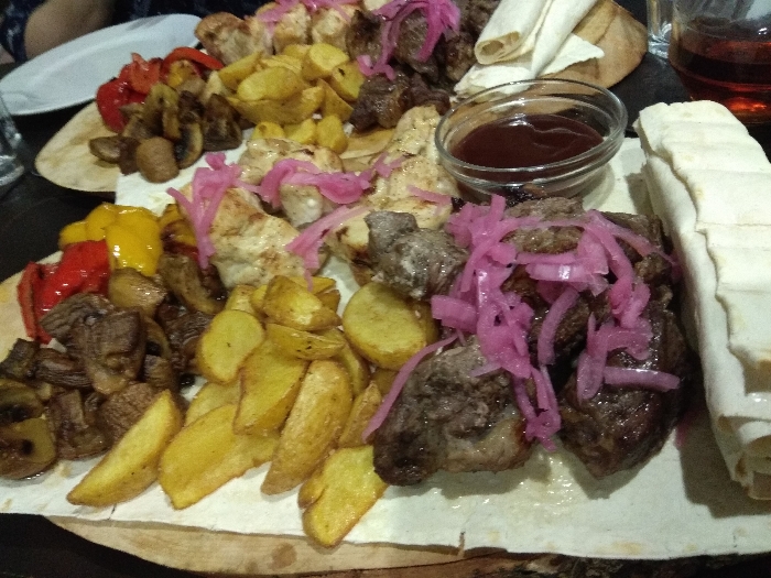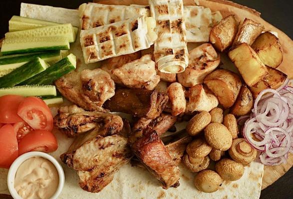 Состав: св. рёбра, кур. филе, кур. крылья, сулугуни-гриль с томатами, шампиньоны-гриль, картофель в кожуре, св. огурец, св. помидор, соус "Русский", лук, лаваш.