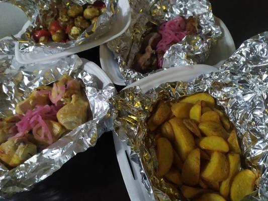 Состав: св. шея, св. рёбра, кур. бёдра, сулугуни-гриль с томатами, картофель в кожуре, св. огурец, св. помидор, соус "Сладкий чили", лук, лаваш.